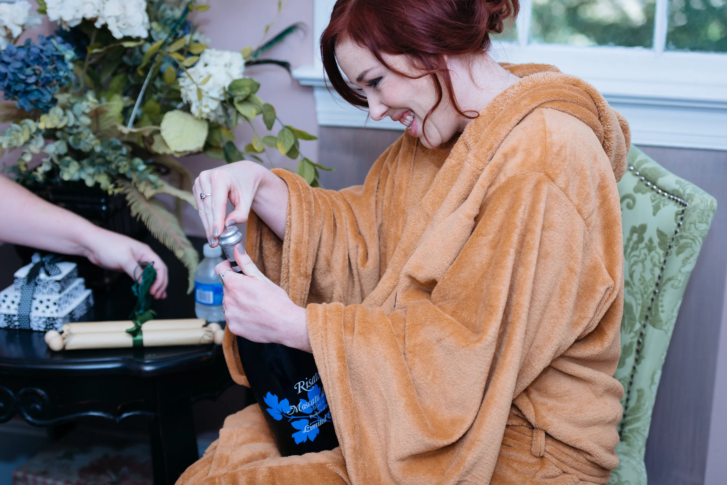 Woman in a brown robe opening a bottle of prosecco next to a table with gifts and flowers.