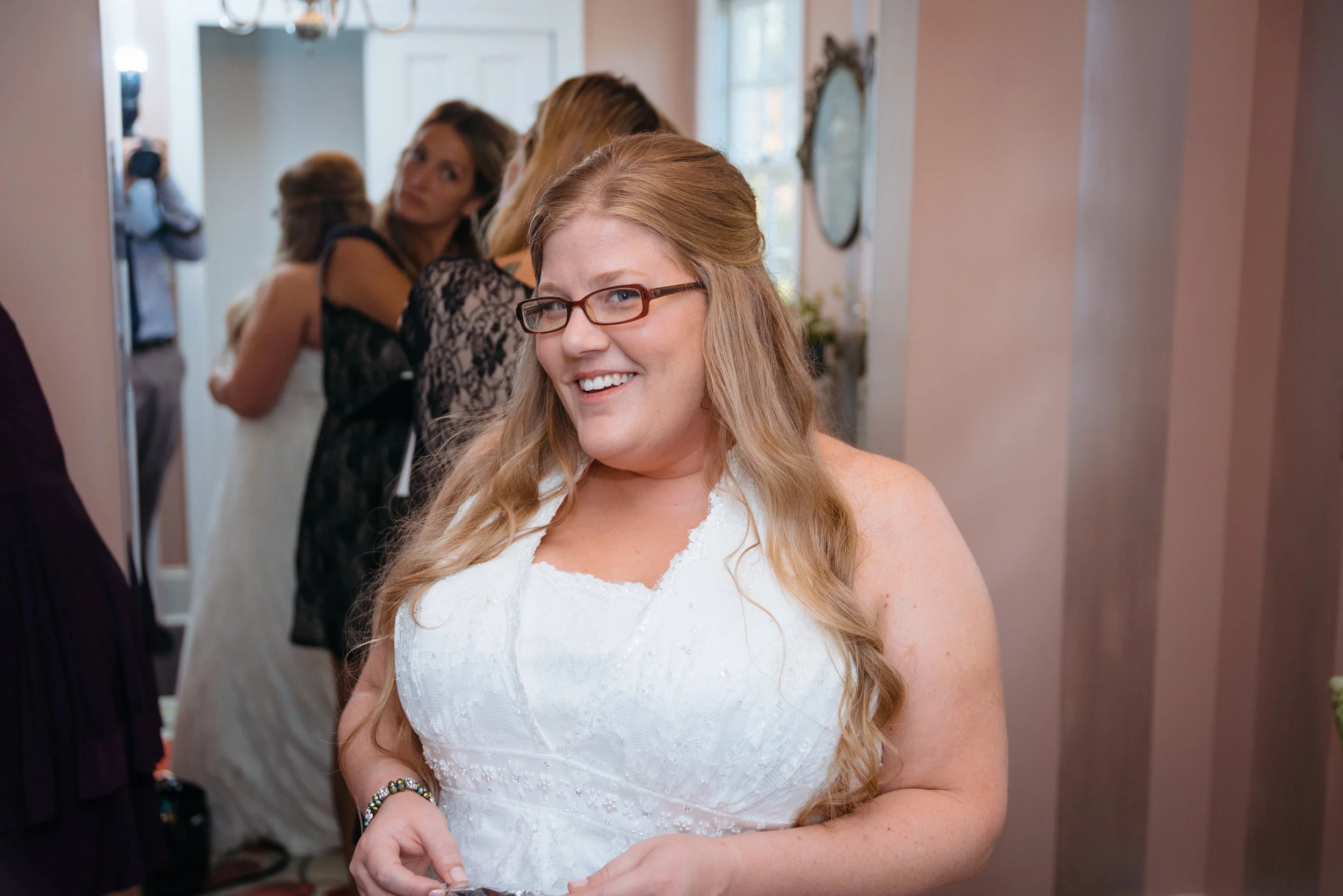 Smiling woman in white dress and glasses in a room with others and a mirror reflection. View fullsize