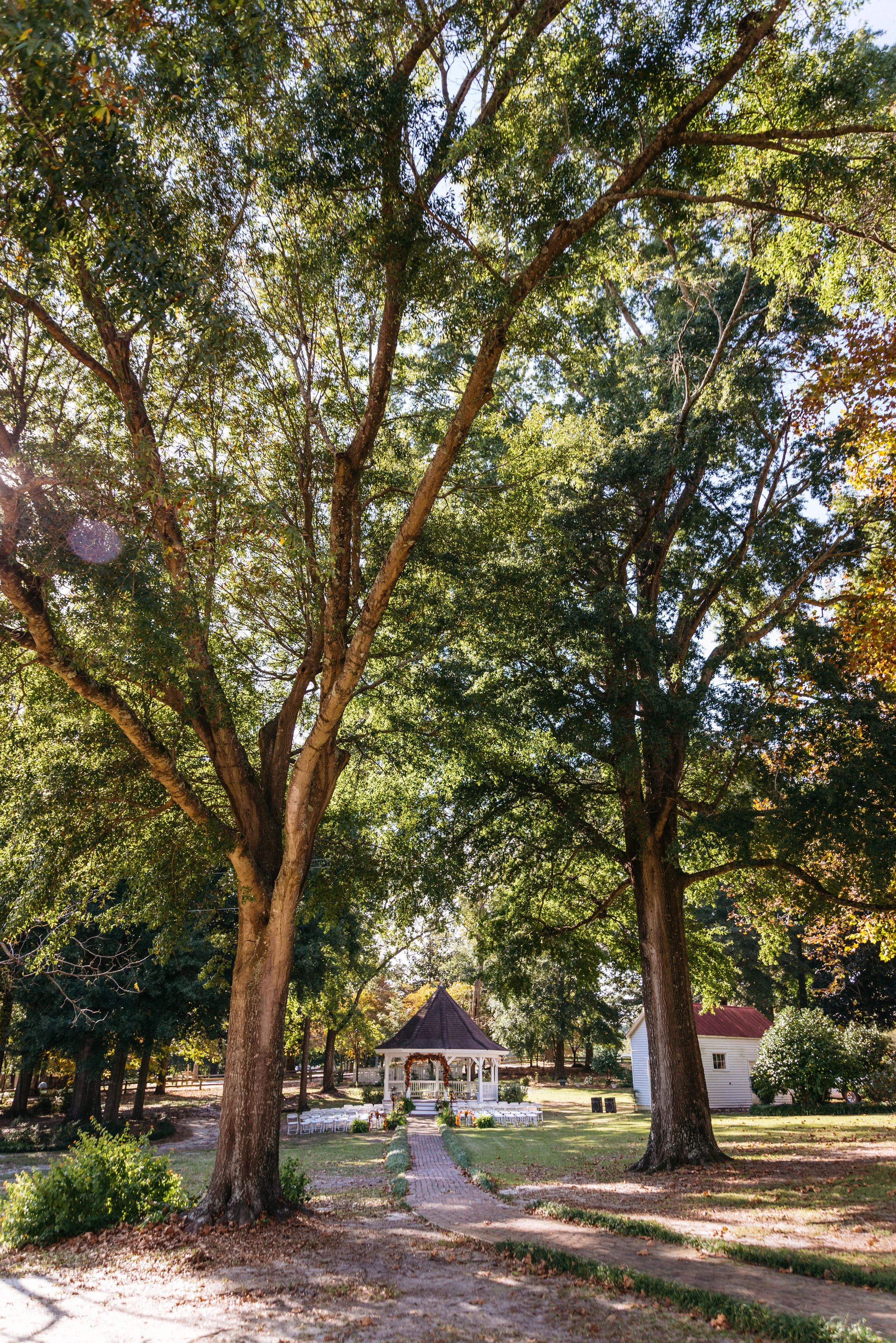 A serene outdoor setting with a gazebo surrounded by trees and a grassy area. The pathway leads to the gazebo, suggesting a peaceful and picturesque location, perfect for gatherings or weddings. View fullsize