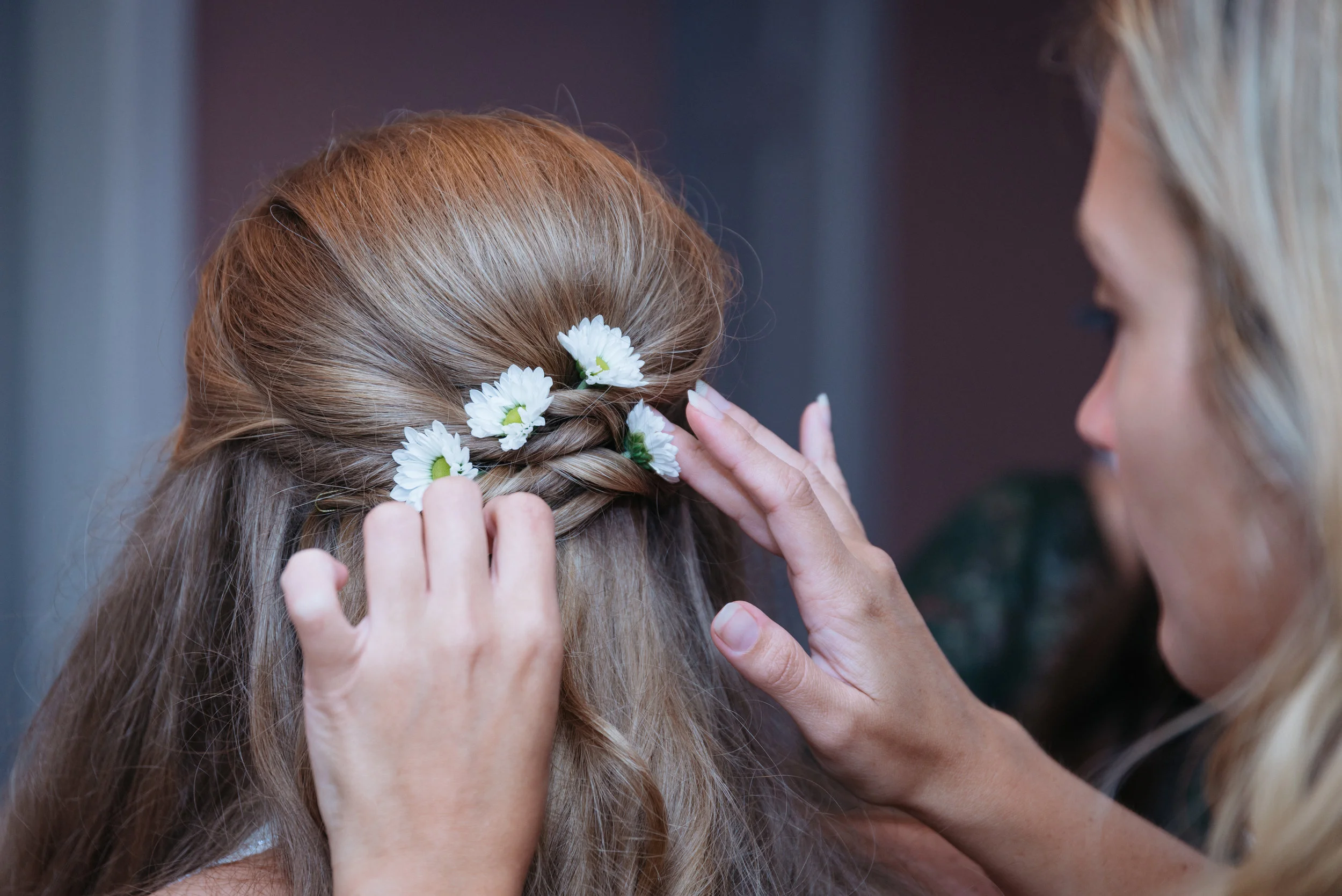 Woman styling another woman's blonde hair with white flowers
