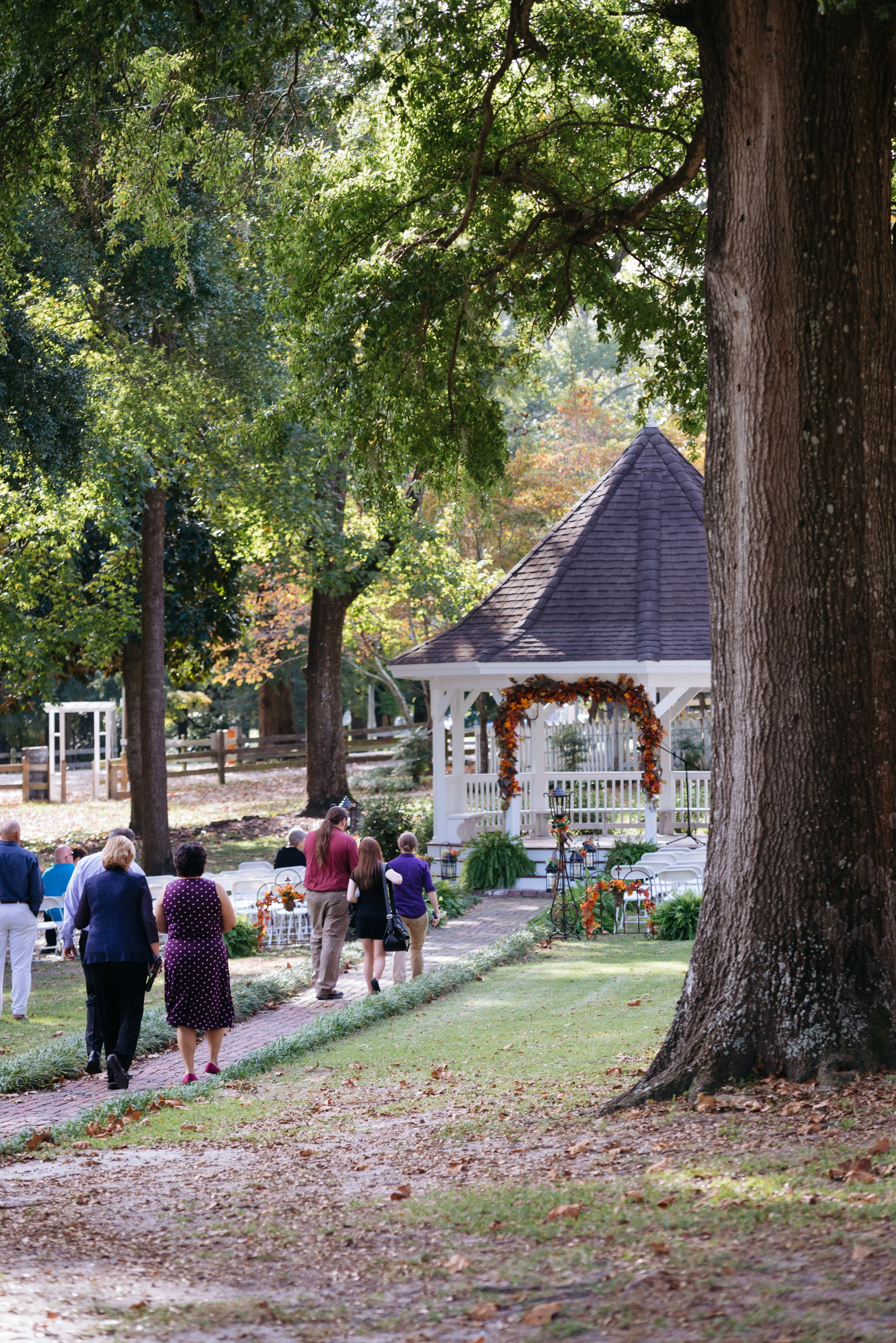 People walking towards a gazebo decorated with autumn-themed foliage in a park setting, surrounded by trees.