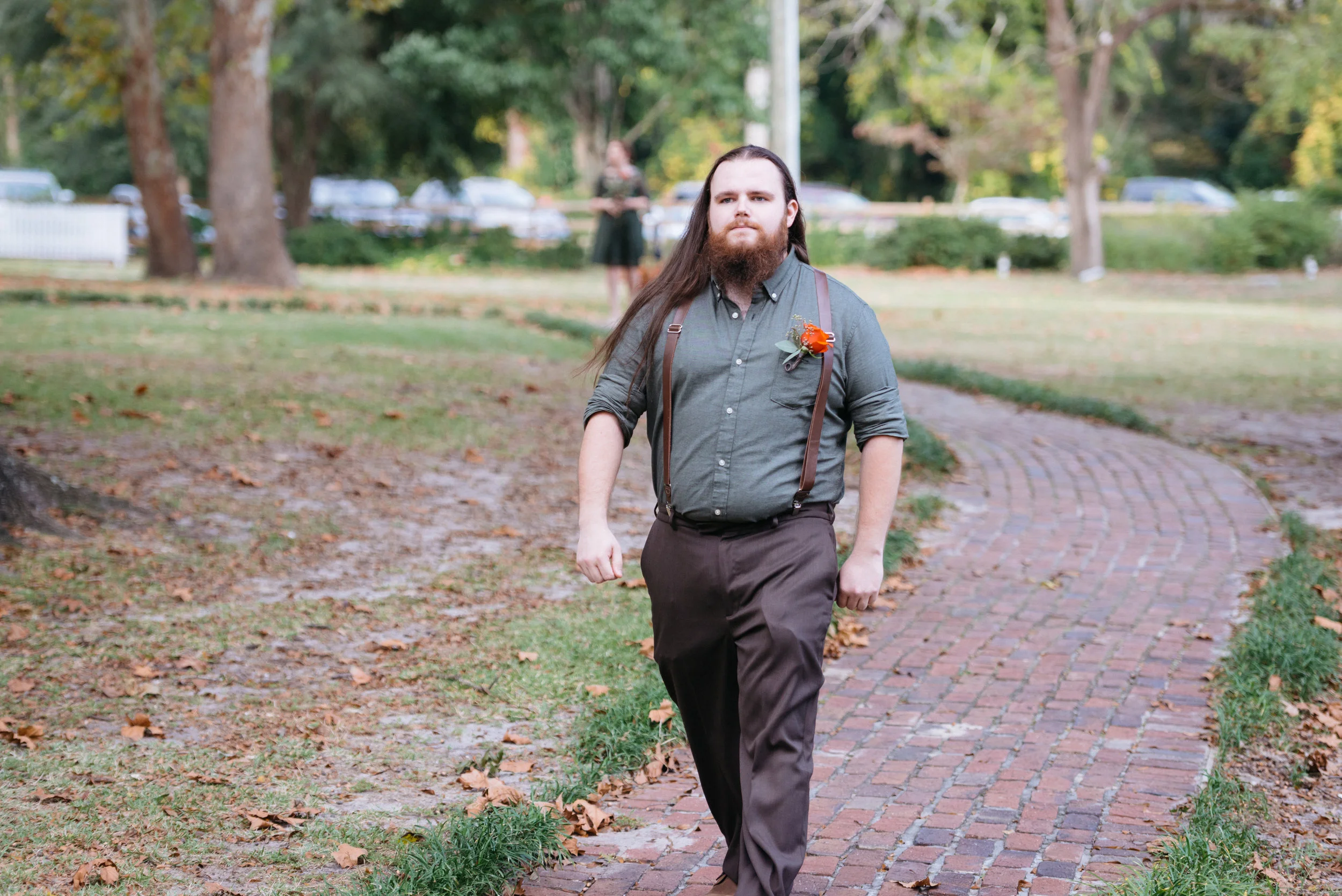 Man with long hair and beard walking on a brick path wearing a green shirt with a boutonniere, brown suspenders, and pants in a park setting.