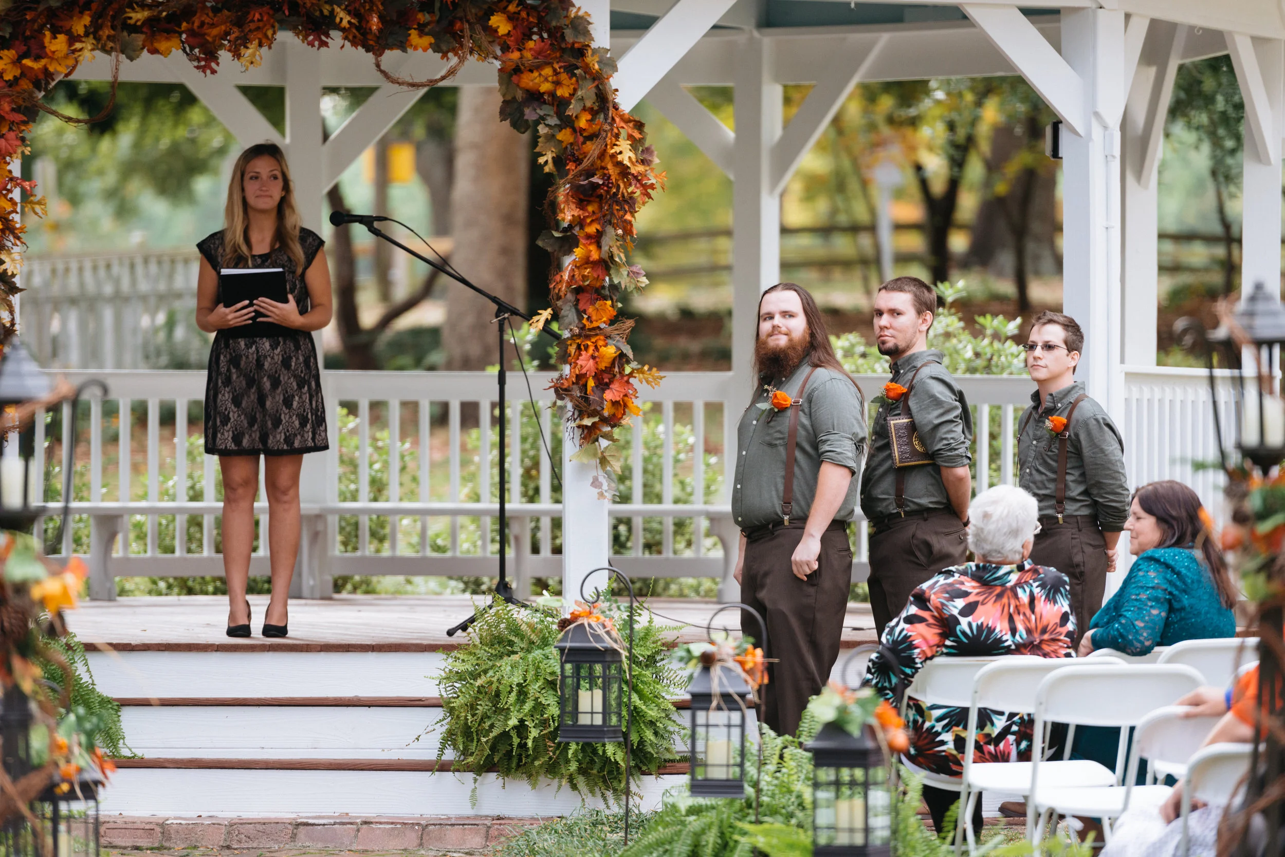 Outdoor wedding ceremony with a female officiant holding a book, three groomsmen in matching attire, and guests seated. Autumn-themed decorations adorn the gazebo and scene.
