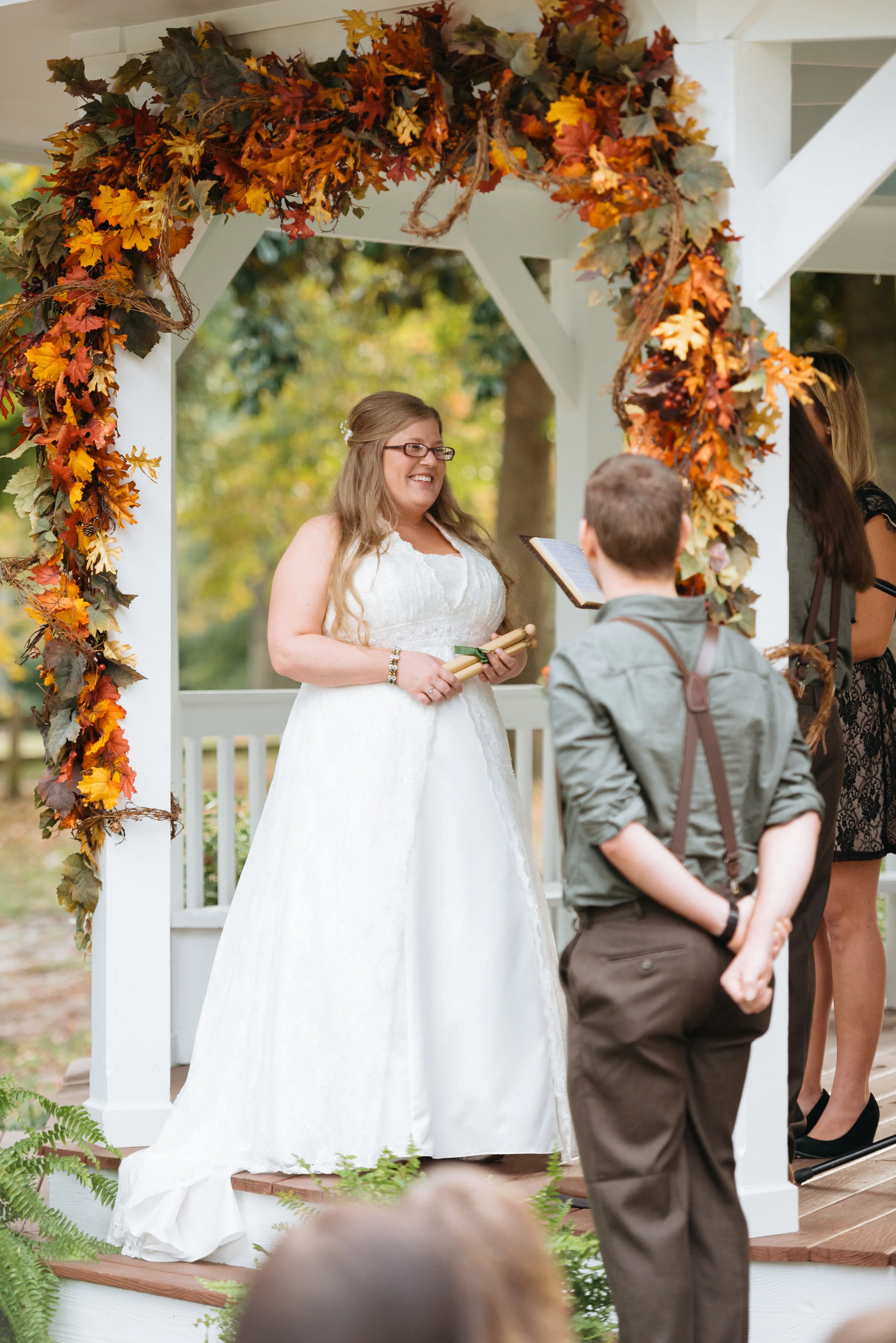 Bride at an outdoor wedding ceremony, standing under a gazebo decorated with autumn leaves, holding scrolls and smiling at the officiant. View fullsize