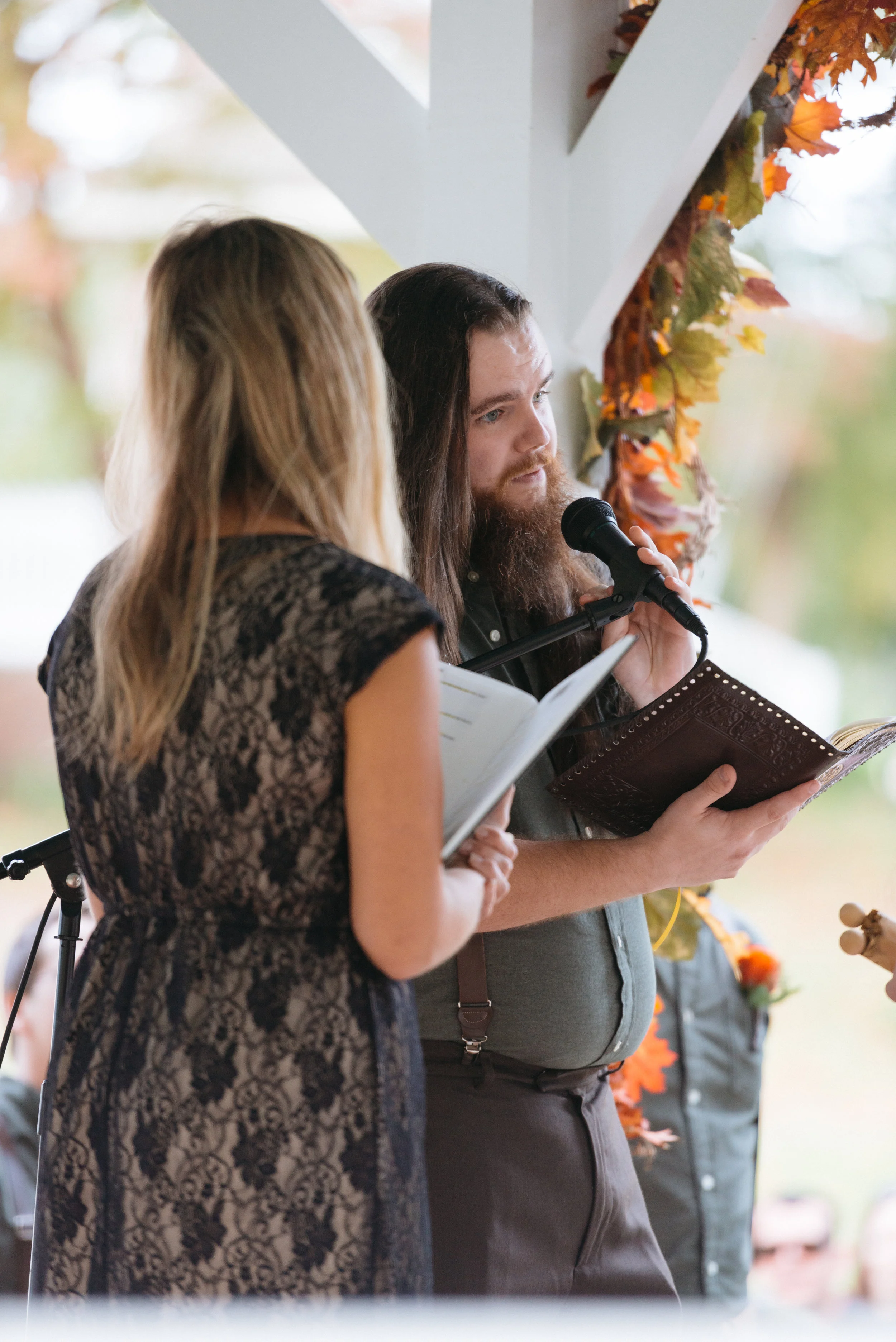 Two people in formal attire, one holding a microphone and book, possibly participating in a ceremony, with autumn decorations in the background. View fullsize