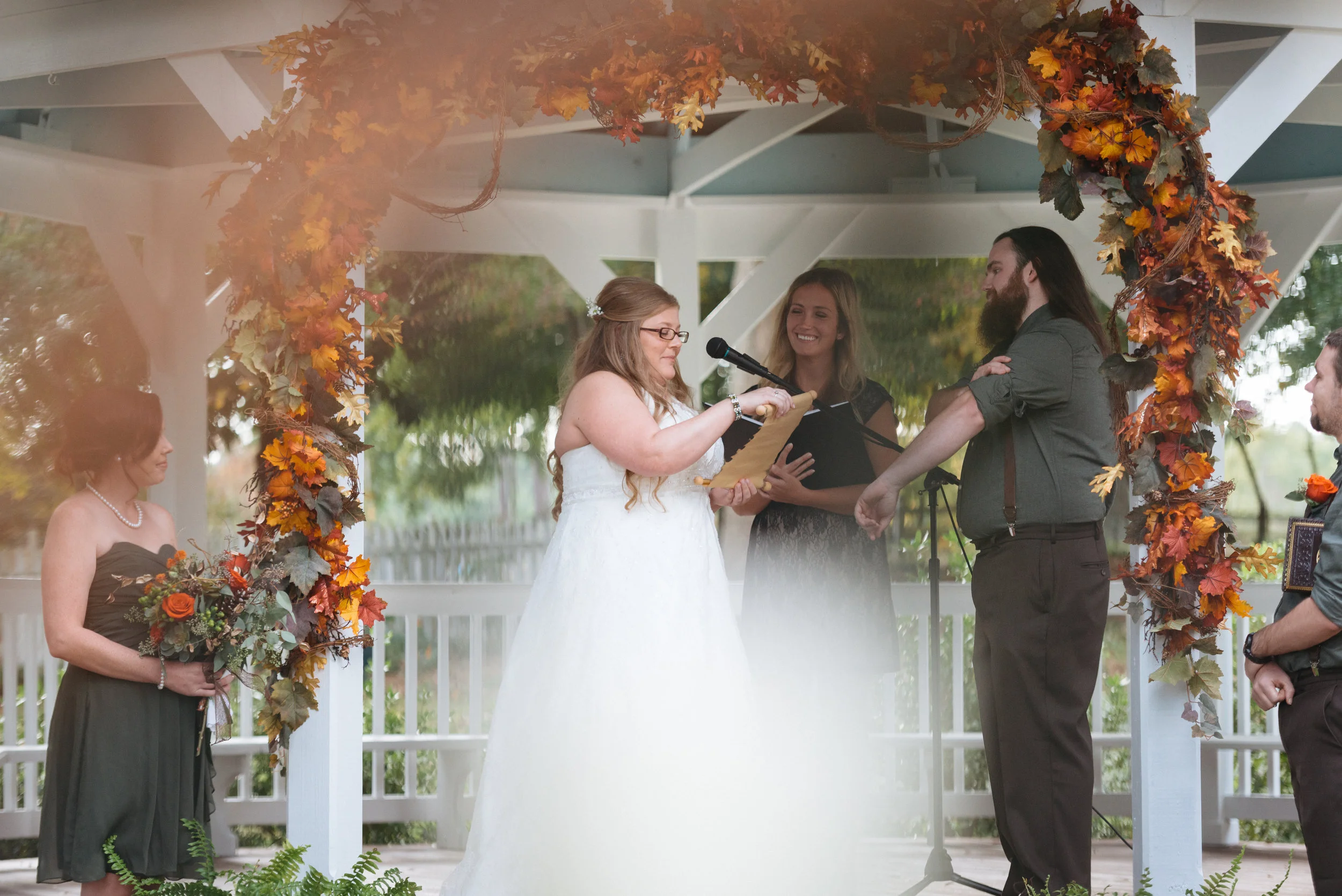 Outdoor wedding ceremony under gazebo with autumn-themed decorations, bride in white dress holding paper, groom with beard in dark attire, bridesmaid holding bouquet.
