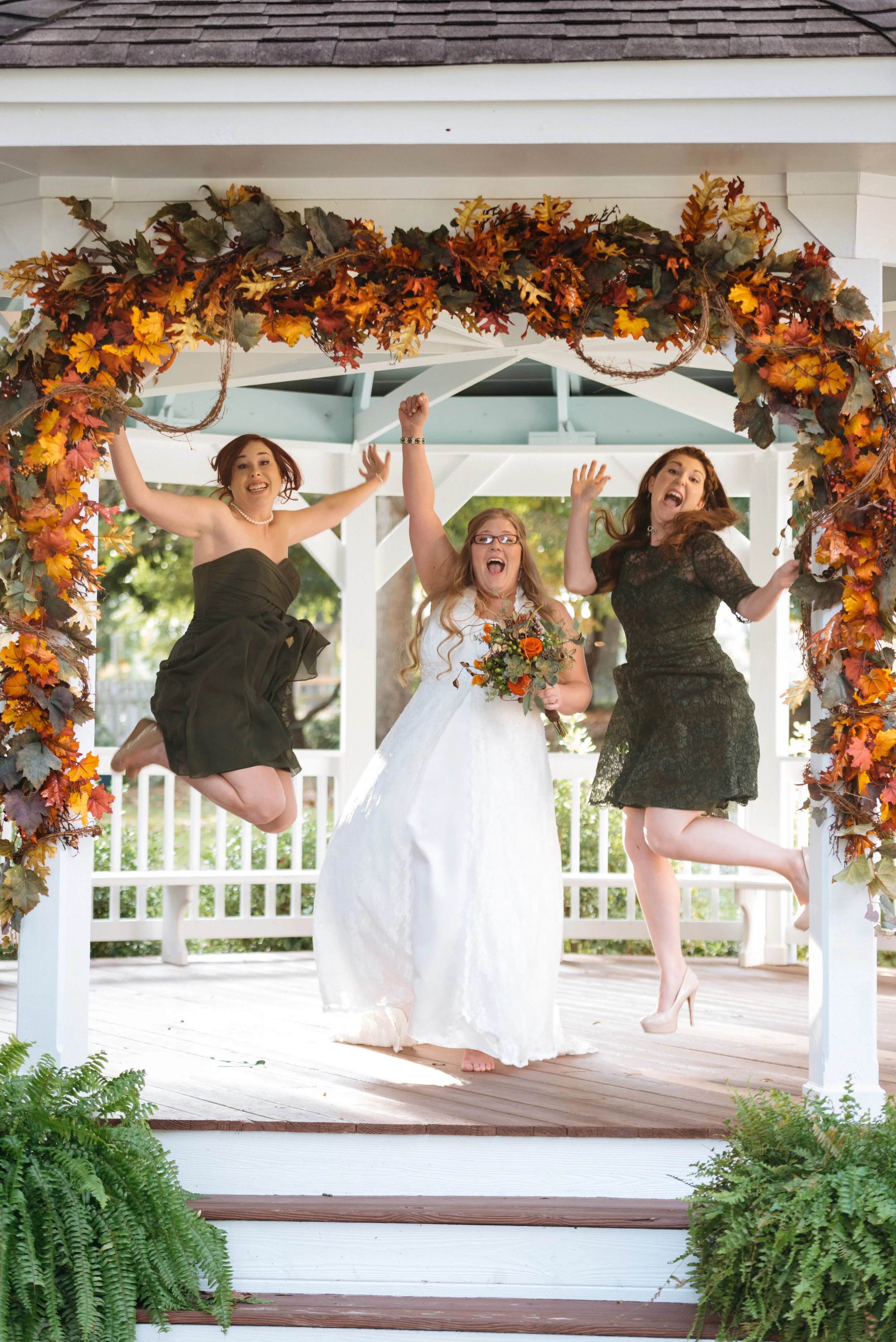 Three women, including a bride in a white dress, joyfully jumping under a gazebo decorated with autumn leaves. View fullsize
