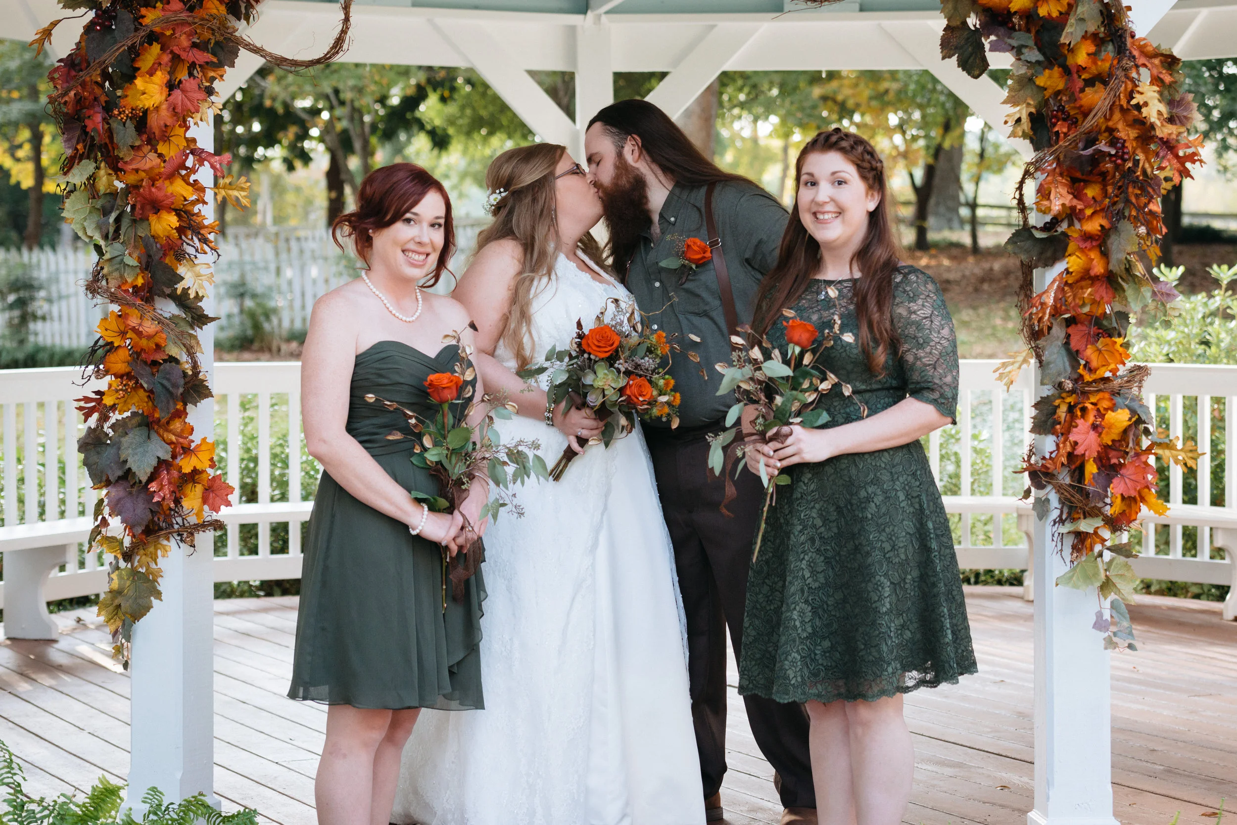 Wedding ceremony in gazebo with bride, groom, and bridesmaids, decorated with autumn leaves and flowers.