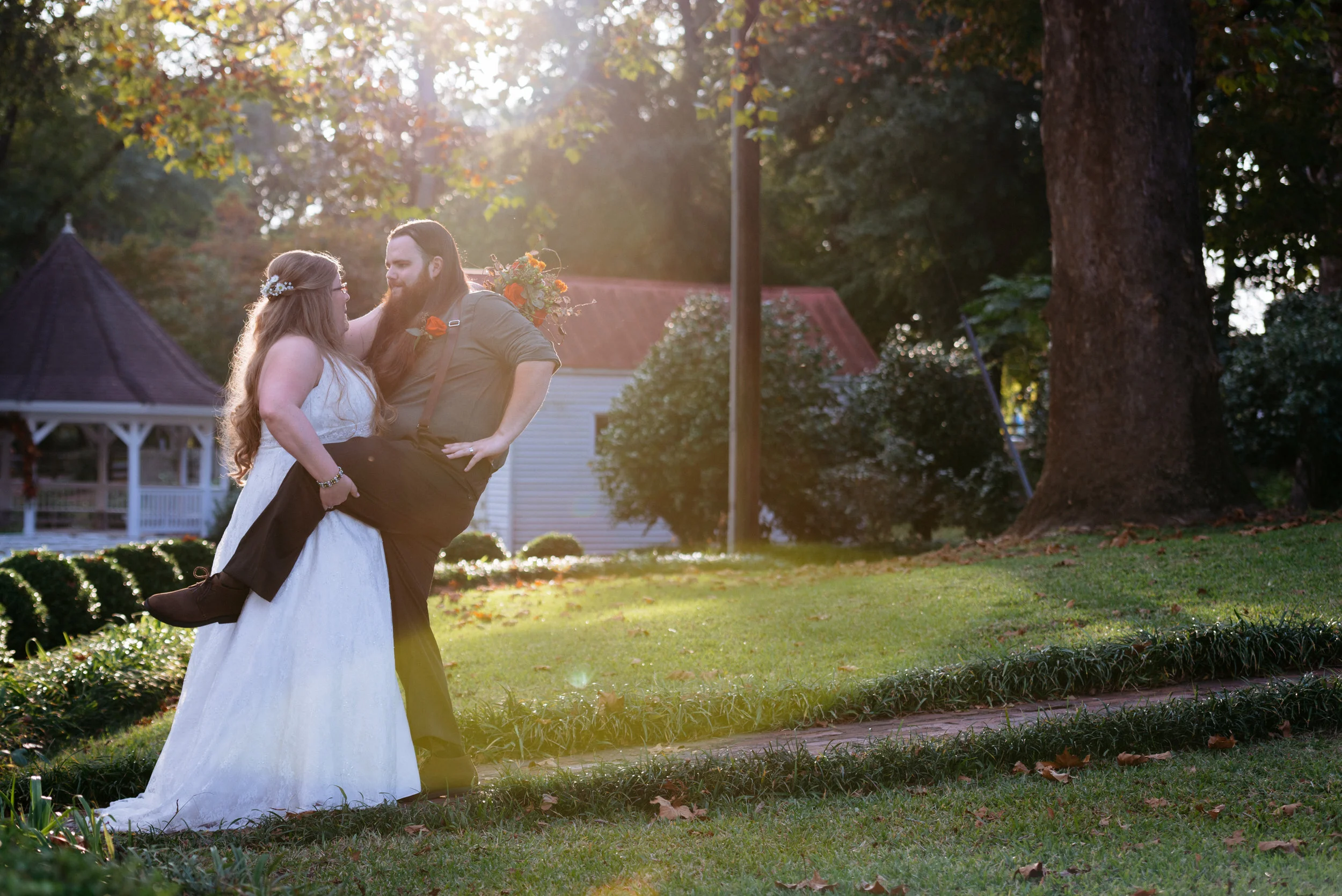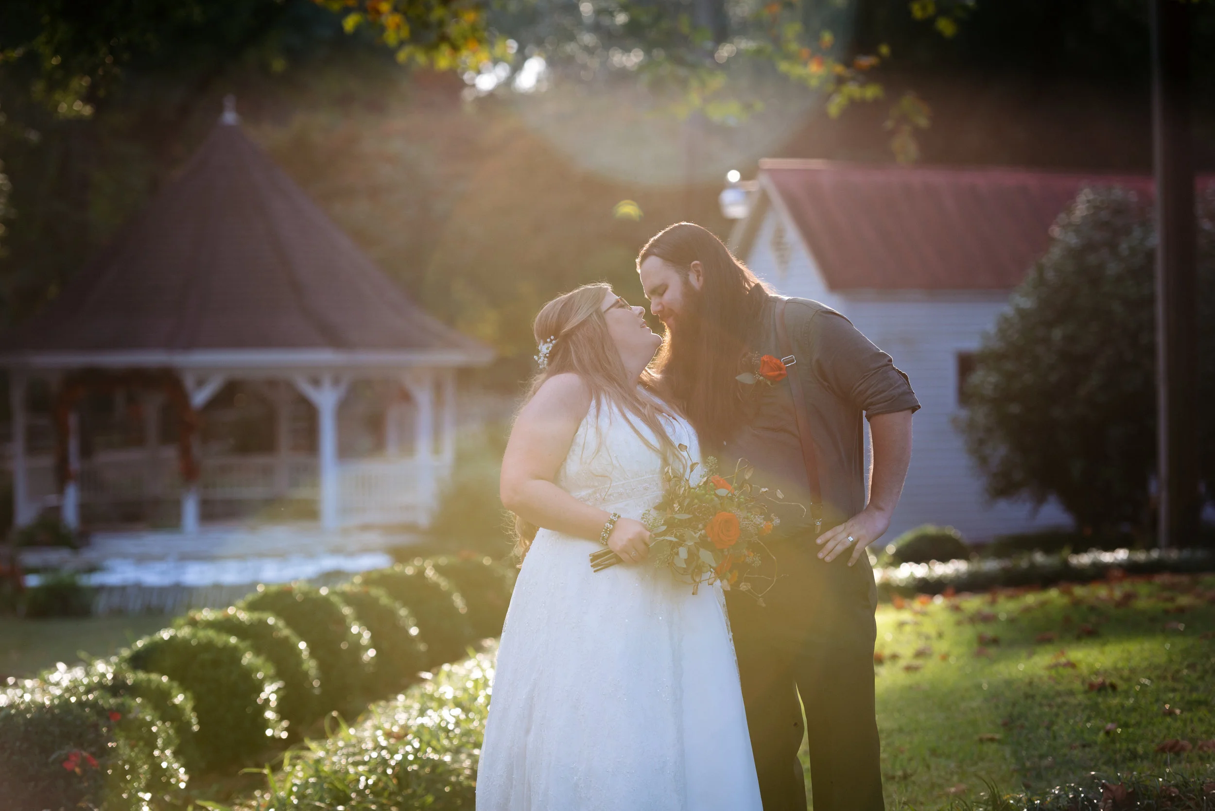 A couple kissing outdoors at sunset in front of a small, white barn with a red roof. The woman is wearing a white wedding dress and holding a bouquet of flowers with orange blooms. The man is in a dark shirt and pants. The background includes trees a