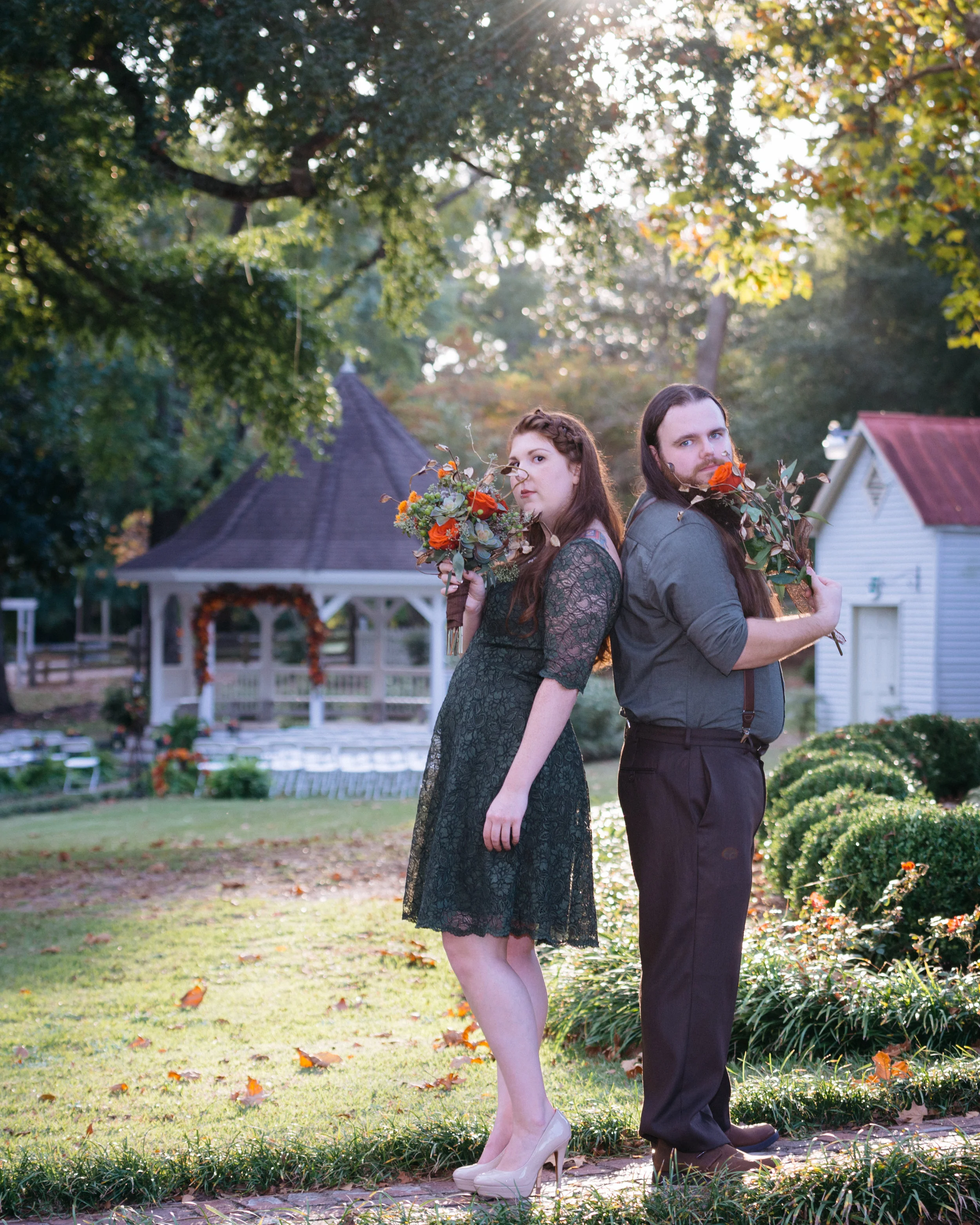 A man and a woman standing back to back in a garden setting, each holding a bouquet of flowers. The woman wears a green lace dress and high heels, while the man is dressed in dark clothing. A gazebo decorated with flowers is visible in the background View fullsize