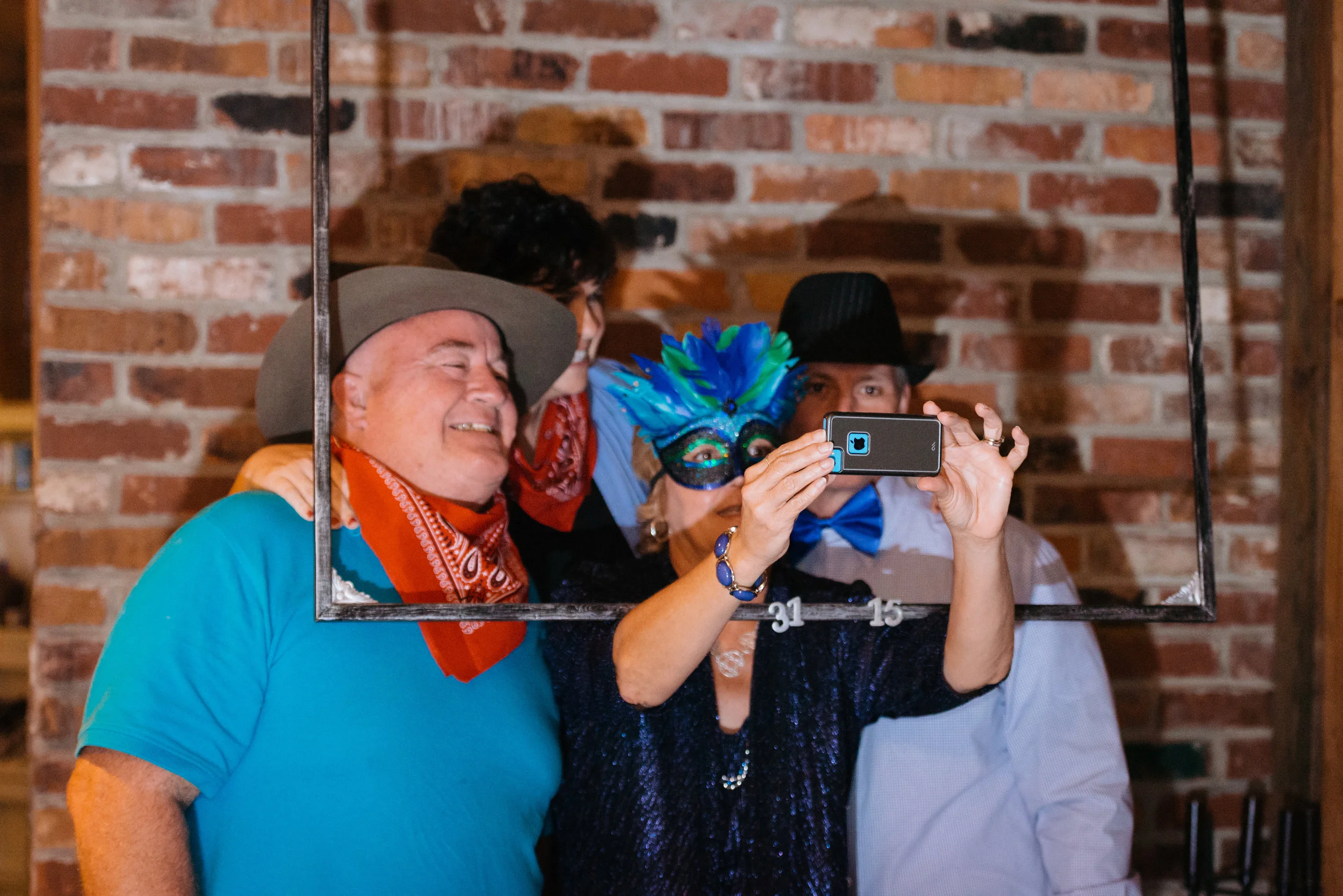 A group of people taking a selfie with a smartphone. One person is wearing a feathered mask, another wears a cowboy hat and bandana. They are posing in front of a brick wall, framed by a large photo frame. View fullsize