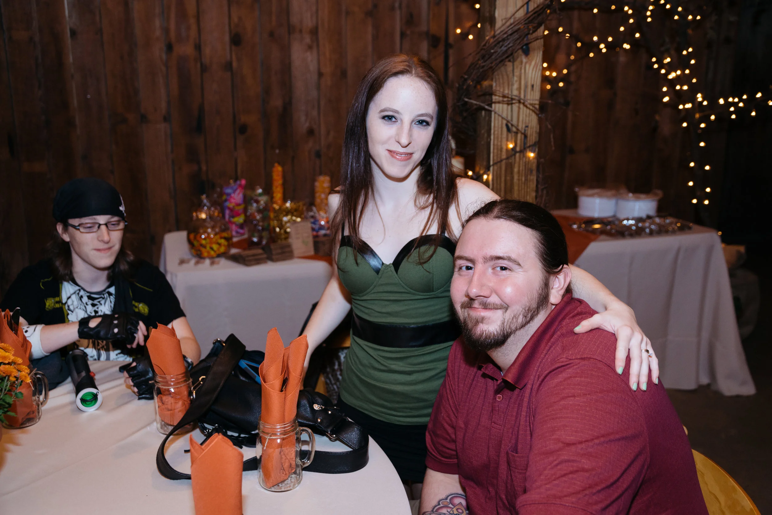 Three people at a table with orange napkins and a black bag, indoors with string lights and a candy table in the background. View fullsize