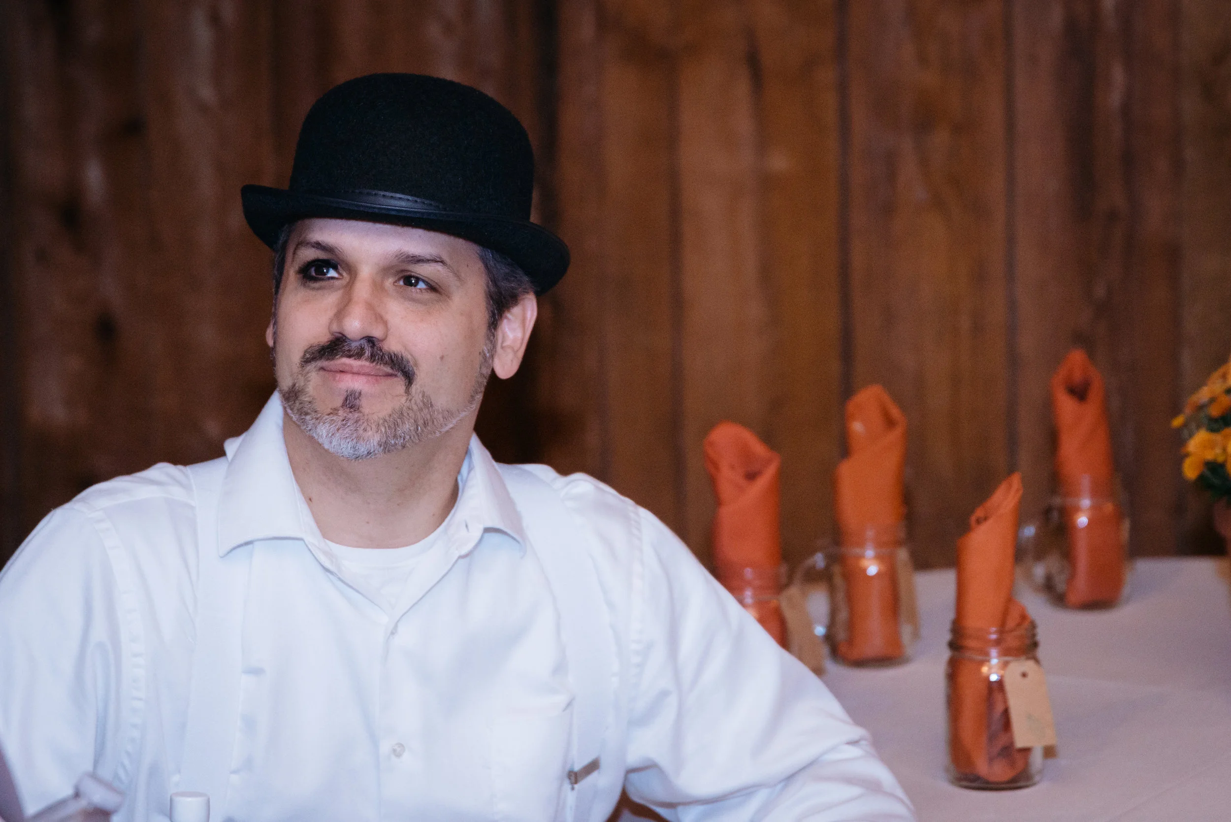 Man wearing a black bowler hat and white shirt, seated at a table with orange napkins in mason jars, wooden background. View fullsize