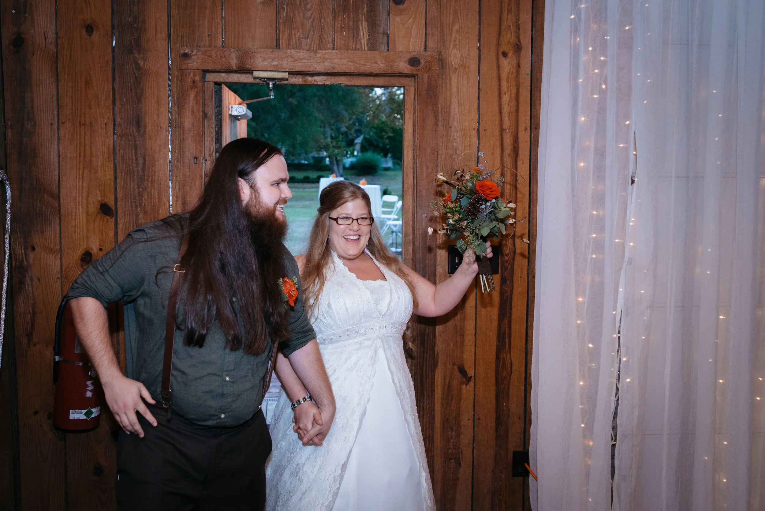 A couple in wedding attire entering a wooden room, holding hands. The bride is holding a bouquet and smiling, while the groom is wearing suspenders and has long hair. The room is decorated with fairy lights.