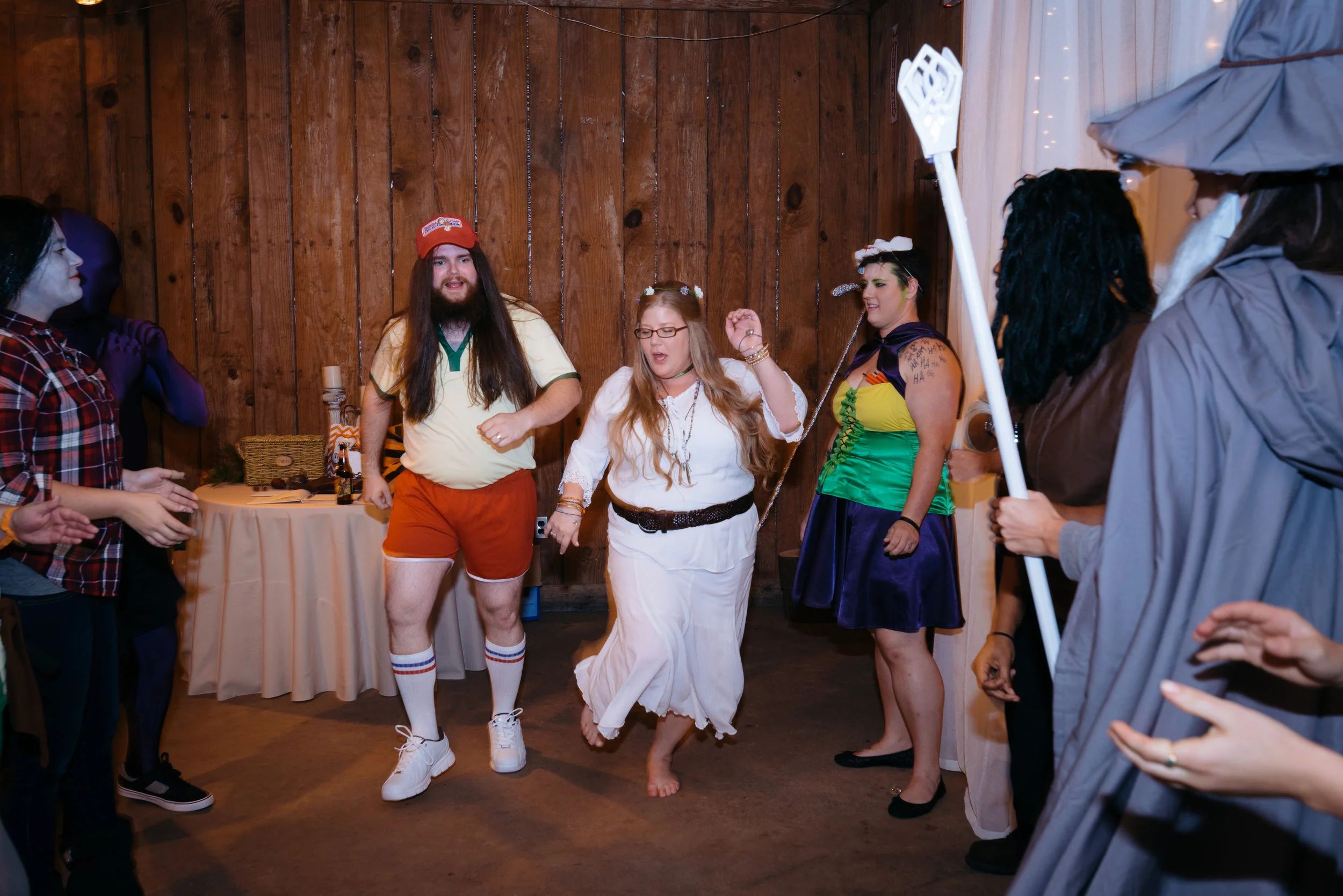 People in costumes at a party, standing and dancing in a wooden room.