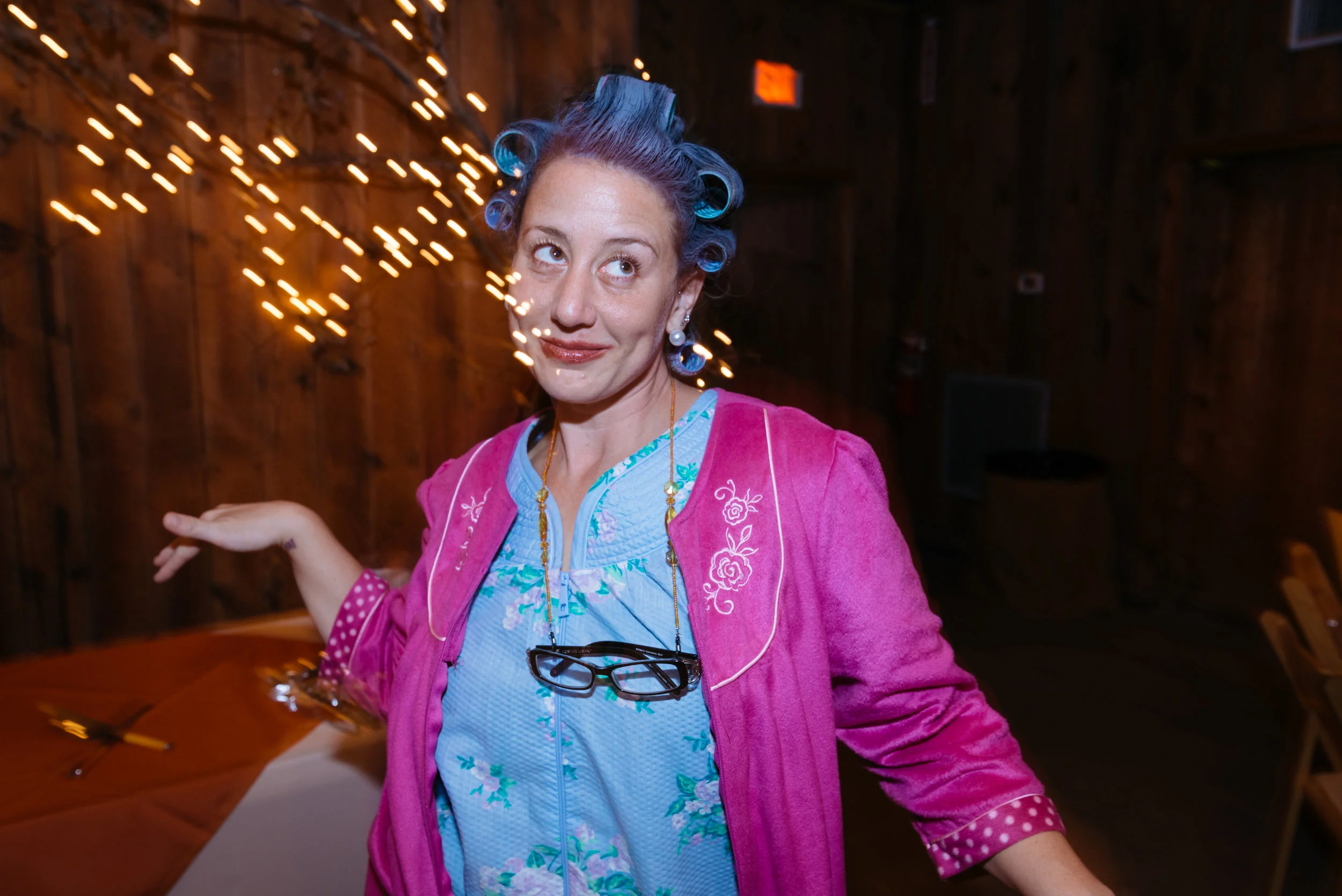 Woman with blue hair rollers wearing pink robe and glasses, standing indoors with decorative lights in background.