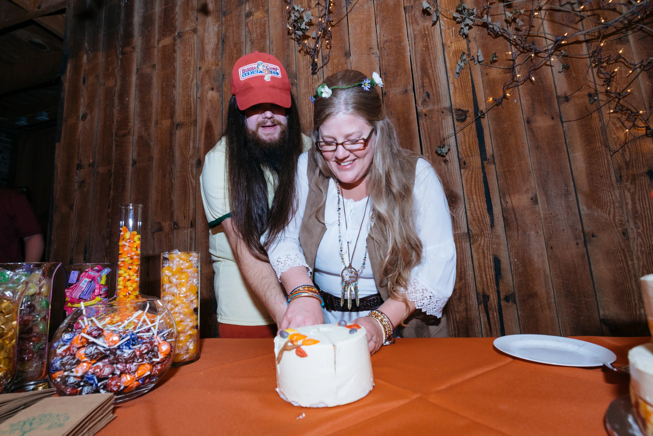 A couple cutting a small white frosted cake on an orange tablecloth, surrounded by jars of colorful candy, with a wooden background and decorative twigs. View fullsize