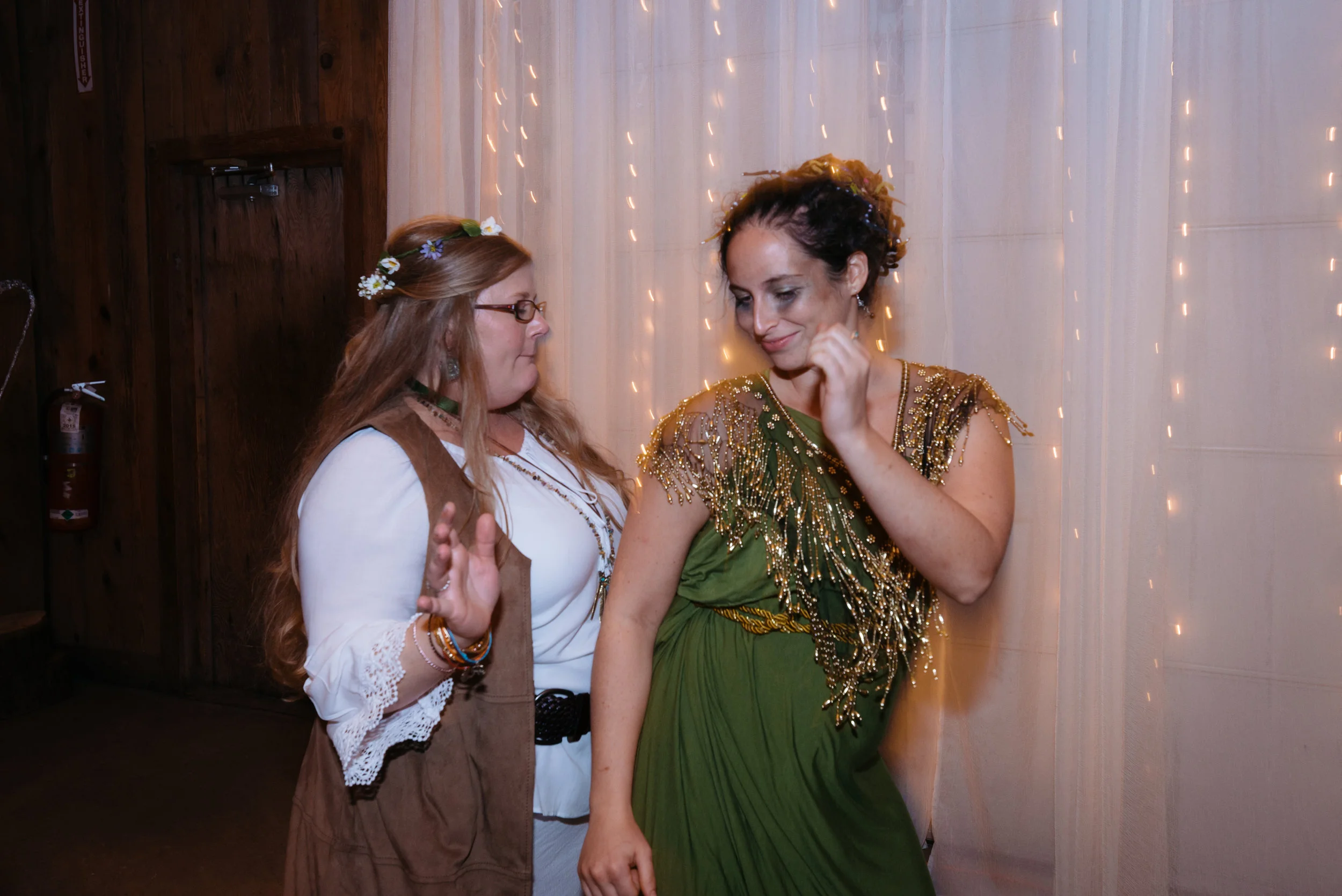 Two women dressed in festive attire dancing indoors with twinkling lights in the background. View fullsize