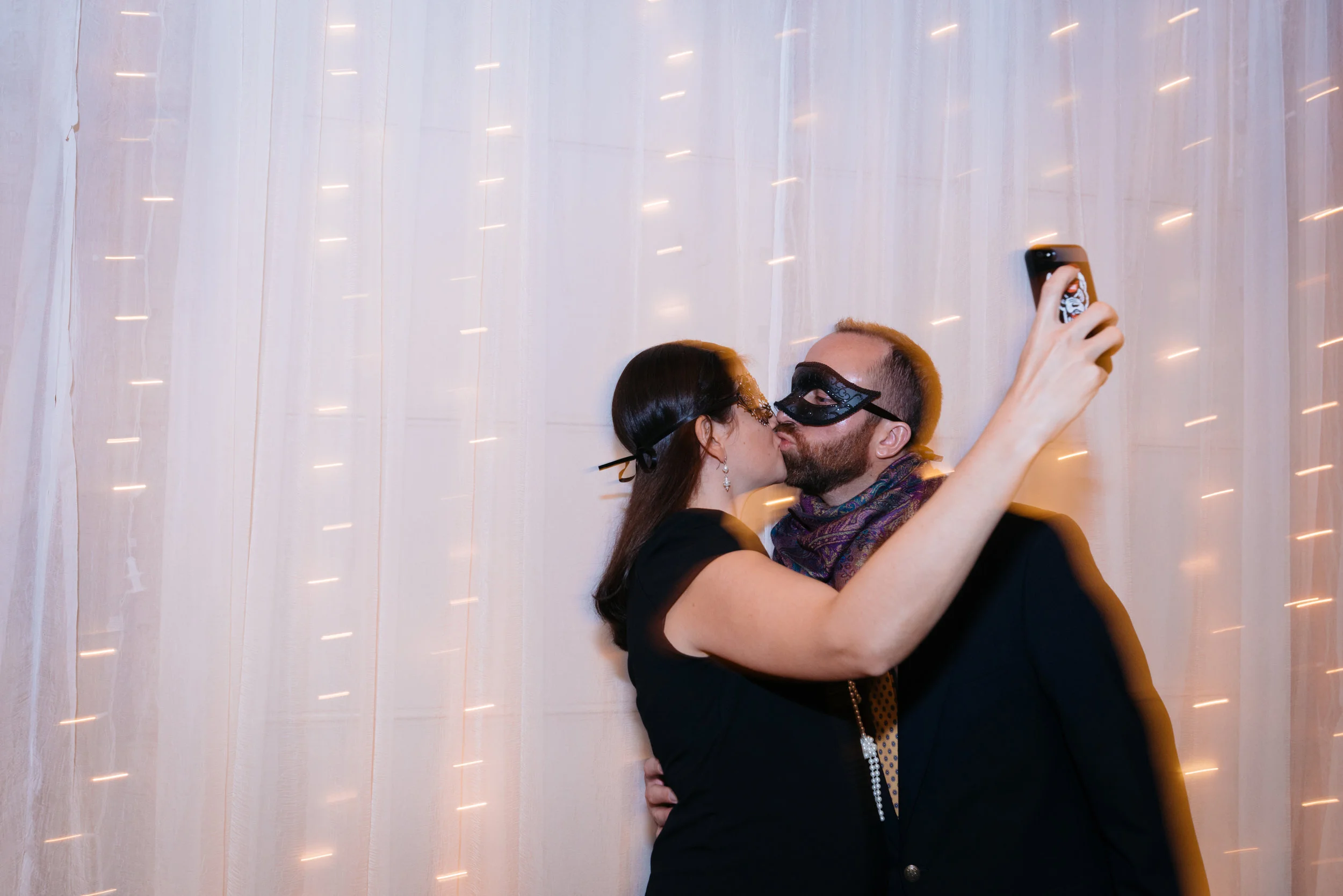 A couple wearing masquerade masks takes a selfie while kissing in front of a backdrop with string lights.