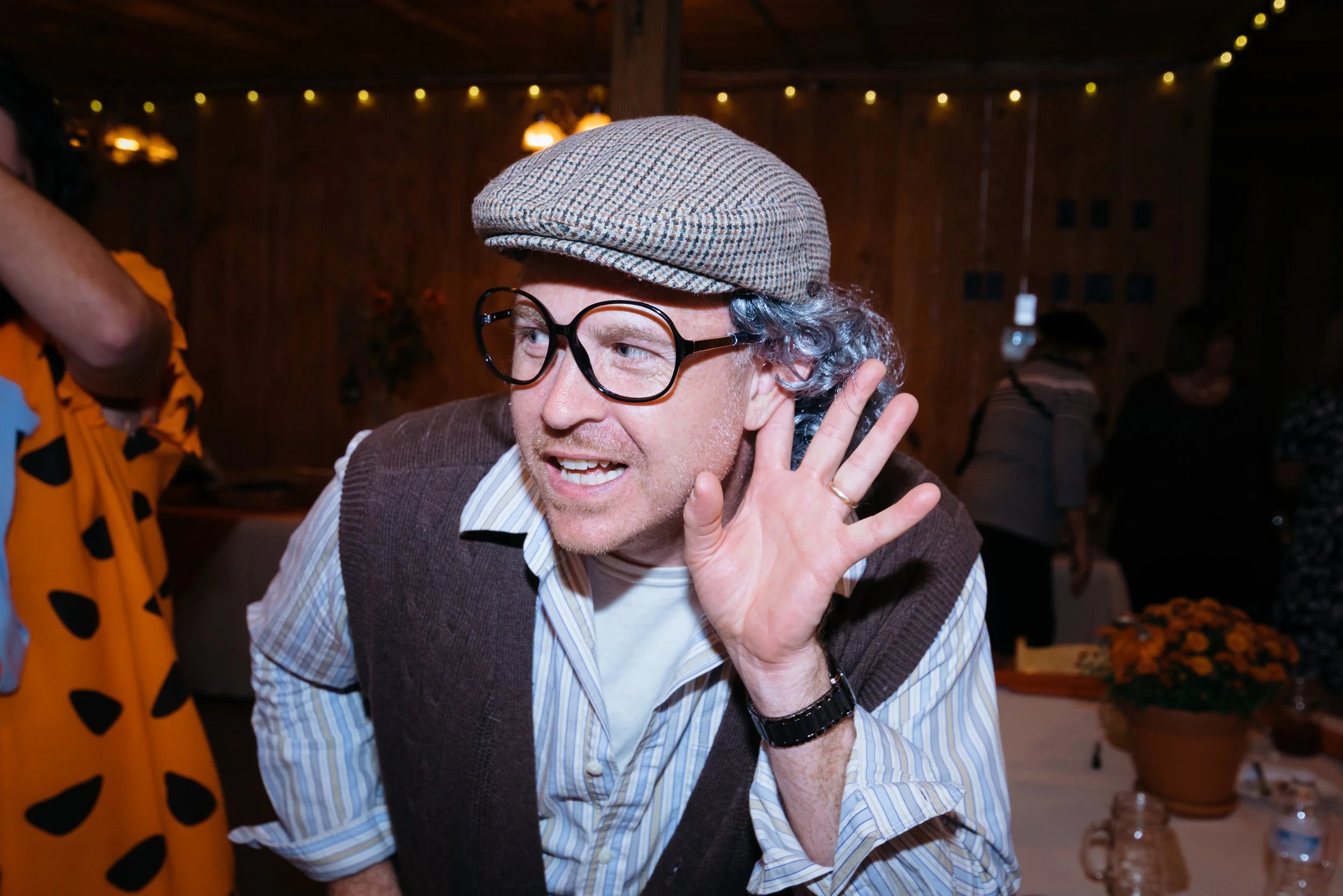 Person in costume with gray wig, glasses, and cap, pretending to listen intently at an indoor event.