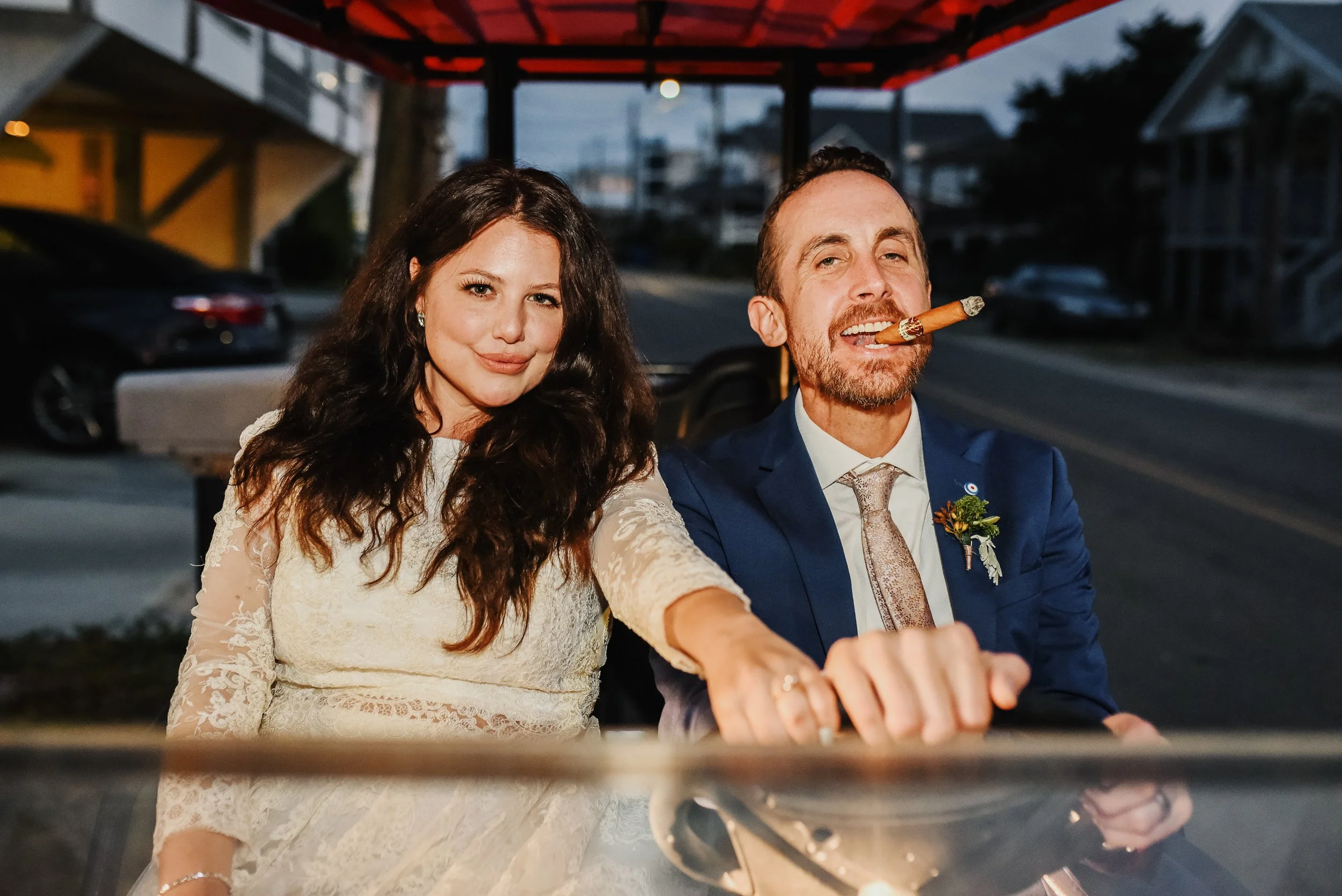 A couple sitting on a golf cart. The woman is in a lace dress, and the man in a blue suit is holding a cigar in his mouth. View fullsize