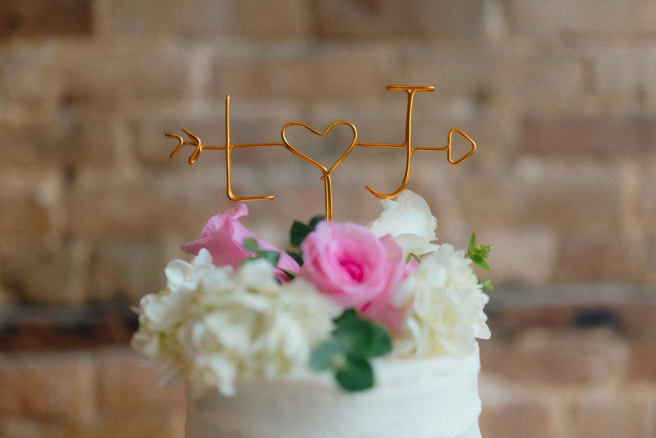 Cake topped with pink and white flowers and a wire topper shaped into initials and a heart. View fullsize