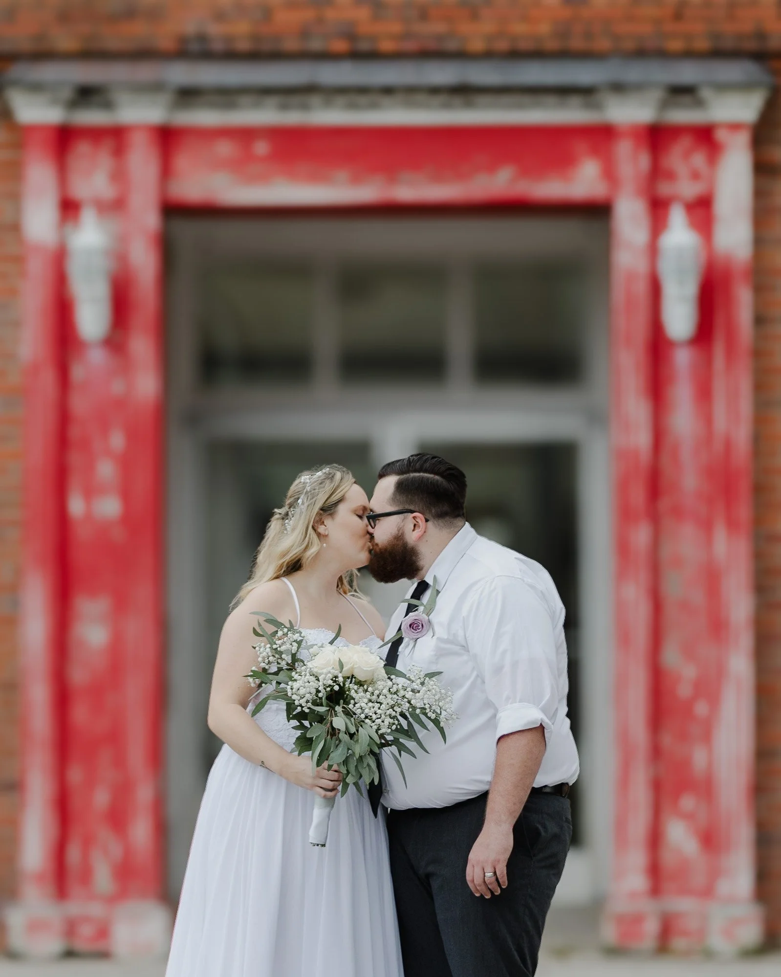 Bride and groom kissing in front of a red brick wall, bride holding a bouquet.