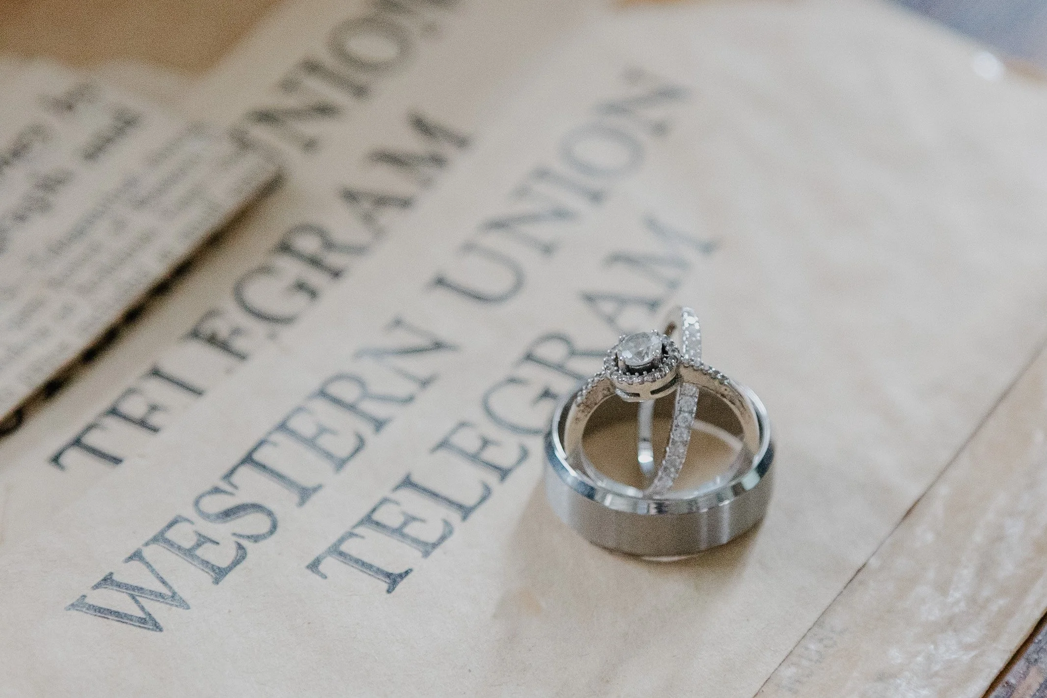 Close-up of wedding rings set on a vintage Western Union telegram.
