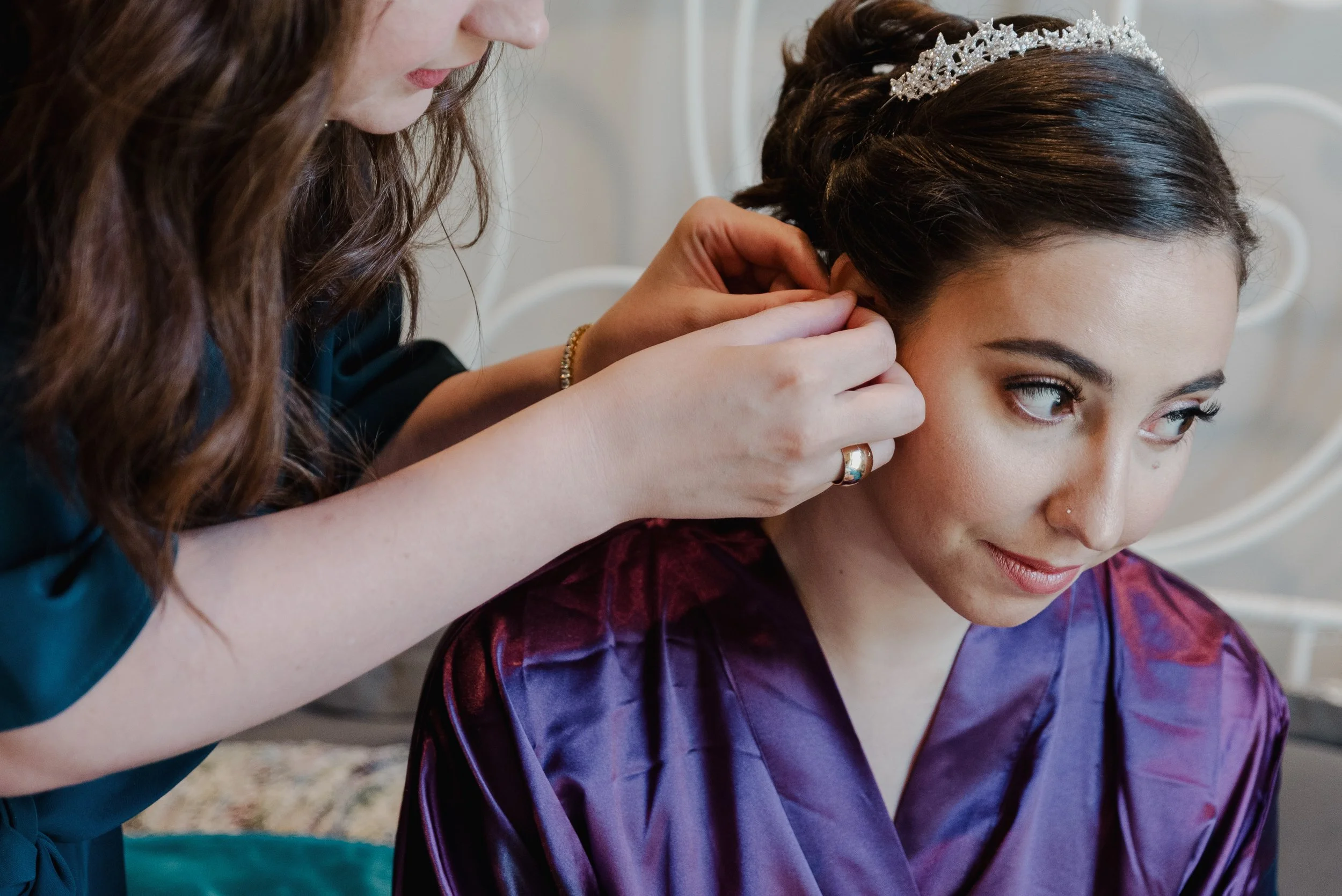 Woman having her earring adjusted, wearing a purple robe and tiara. View fullsize