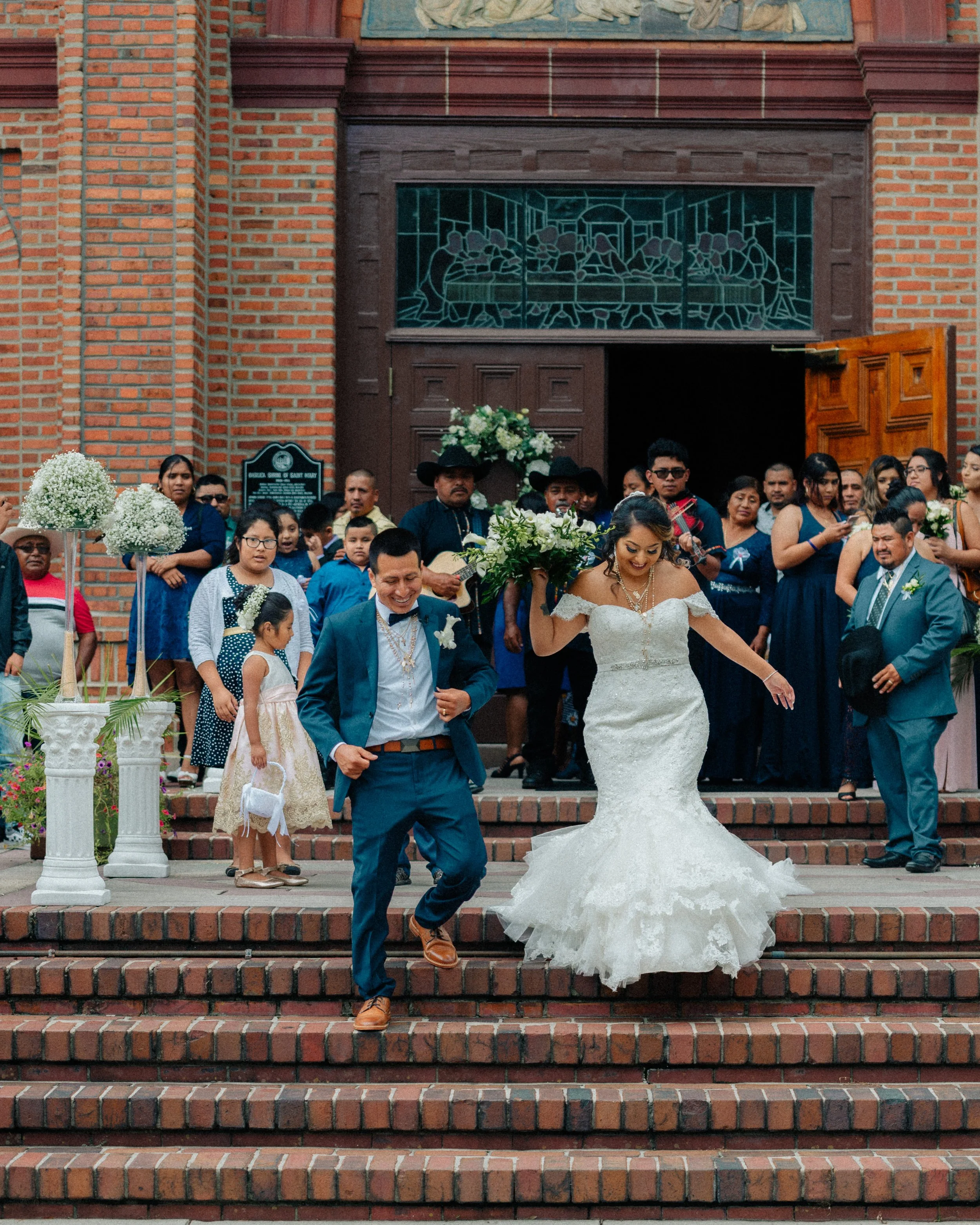 Bride and groom exiting church with guests and flower girl on steps