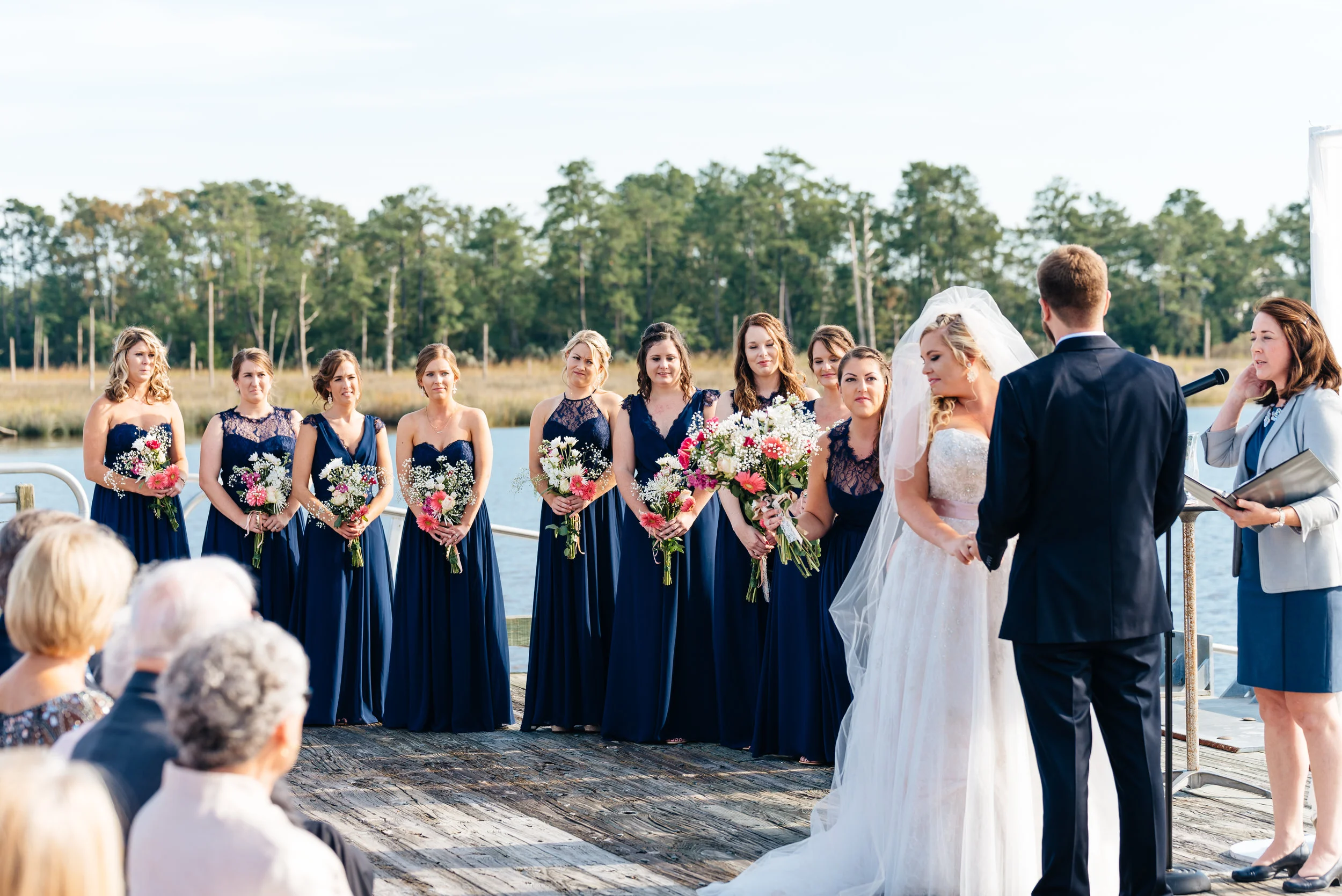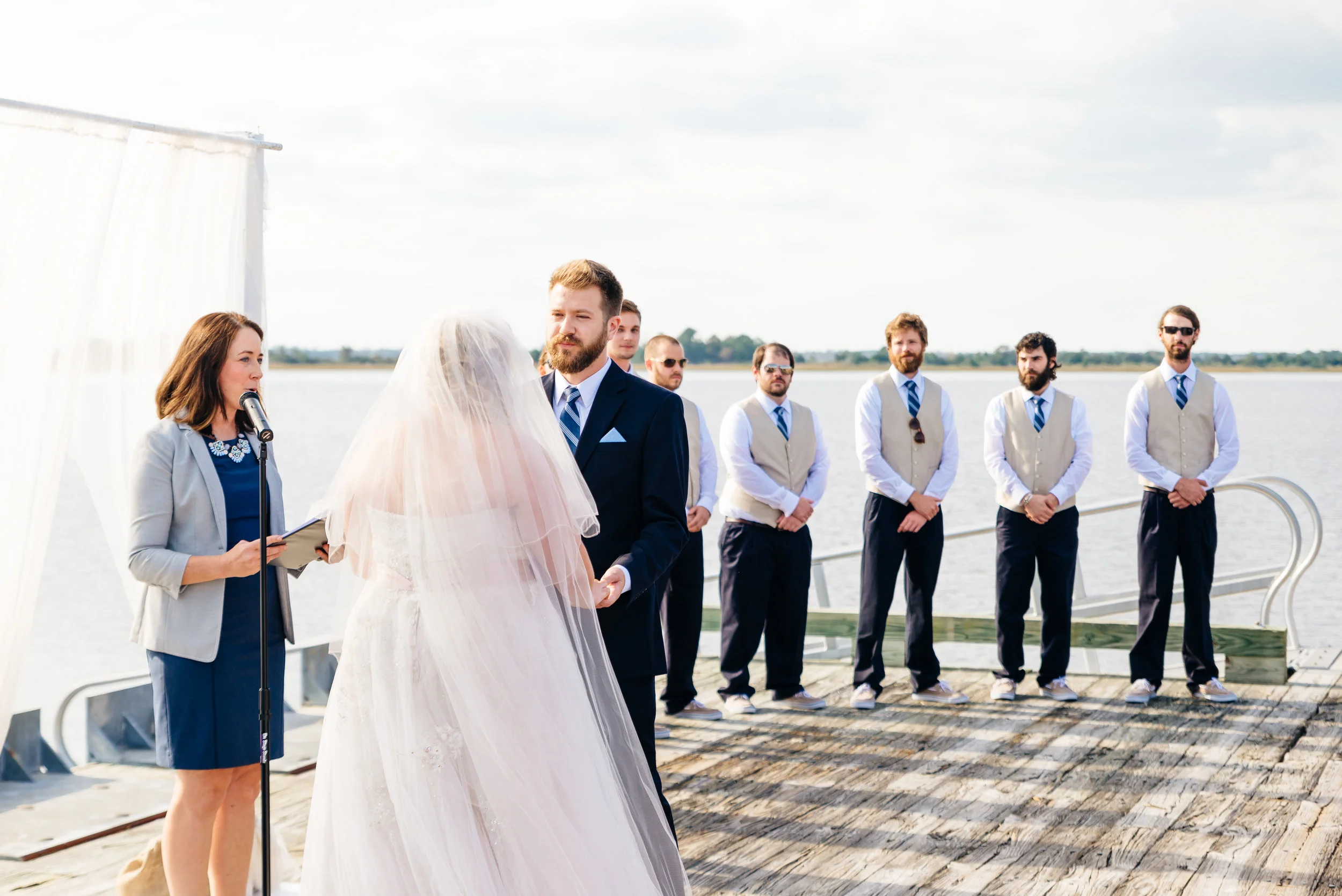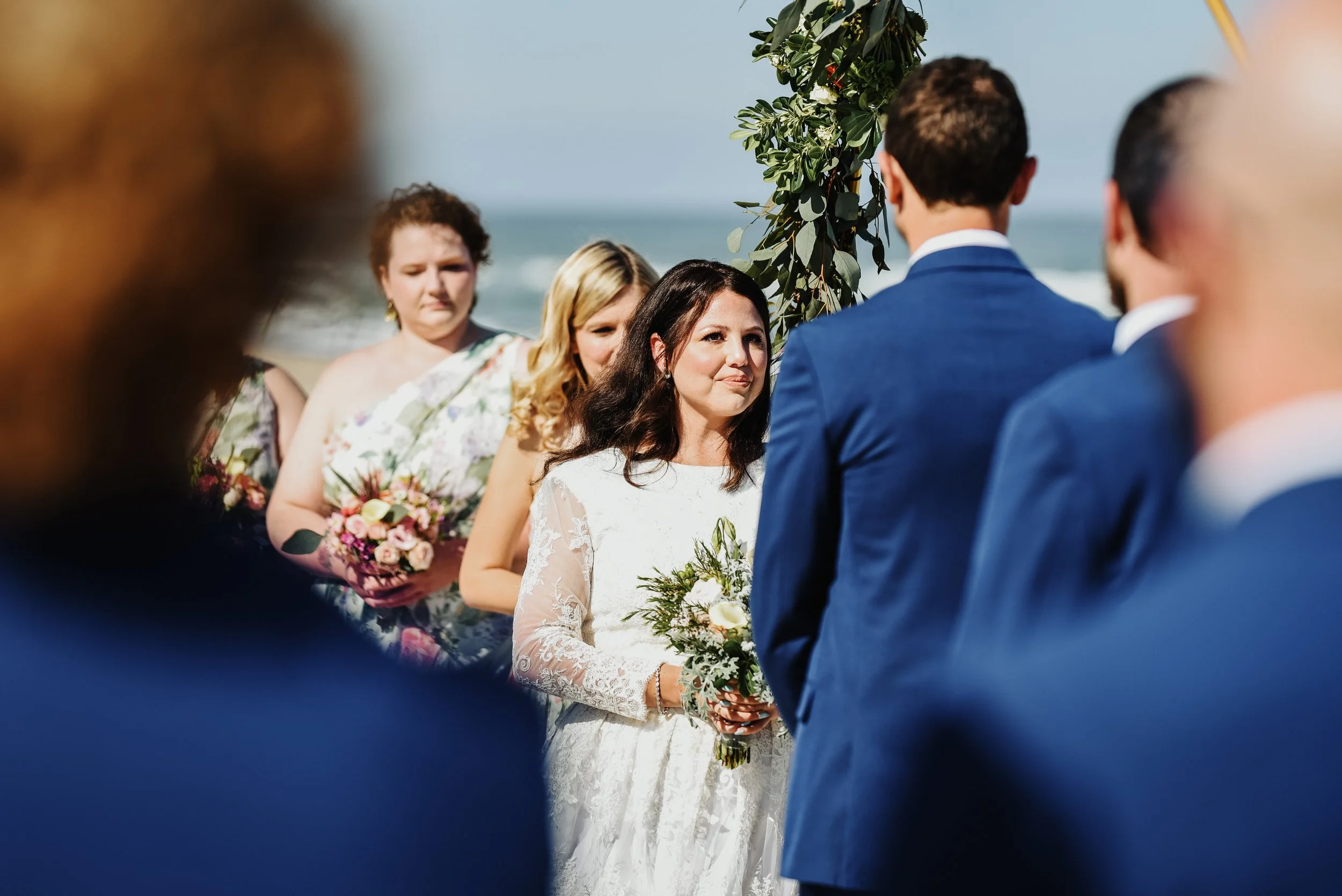 Outdoor wedding ceremony with a bride in a lace dress and groomsmen in blue suits. Bridesmaids hold bouquets, standing near a decorative arch by the ocean. View fullsize