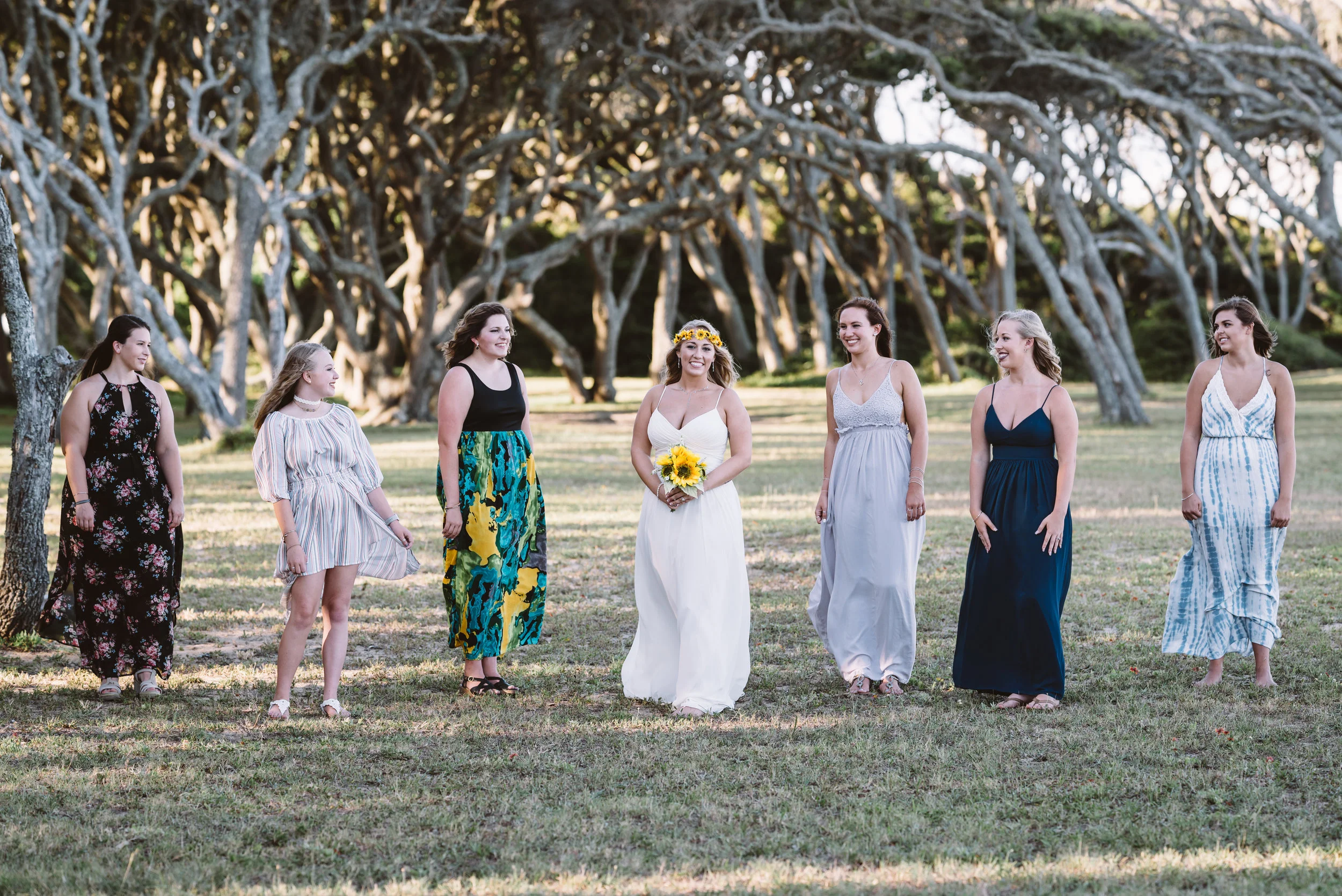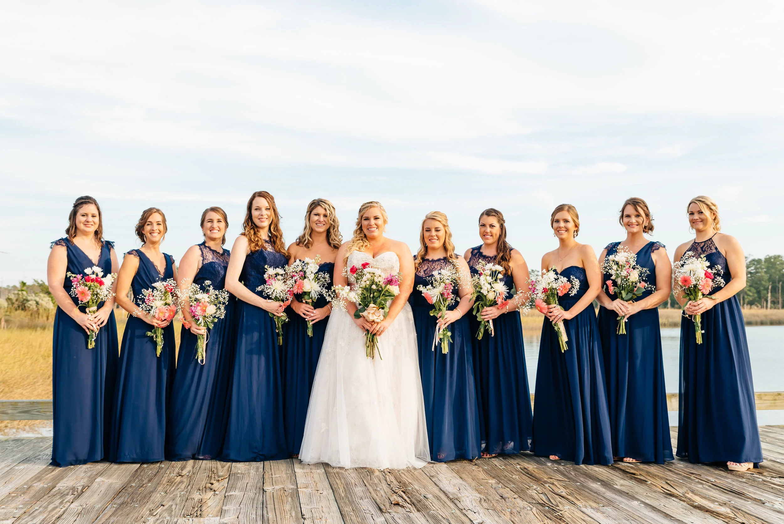 Bride and bridesmaids in blue dresses standing outdoors