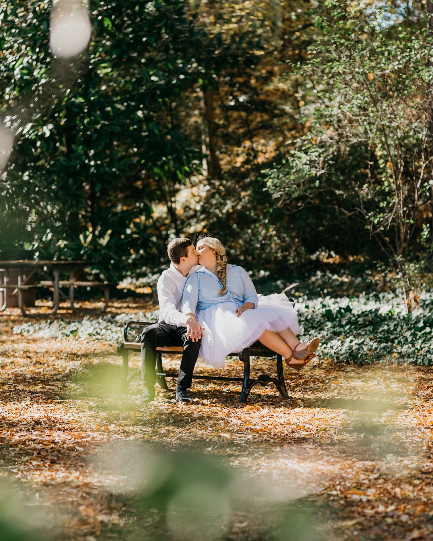 Couple kissing on a park bench surrounded by autumn leaves and trees. View fullsize