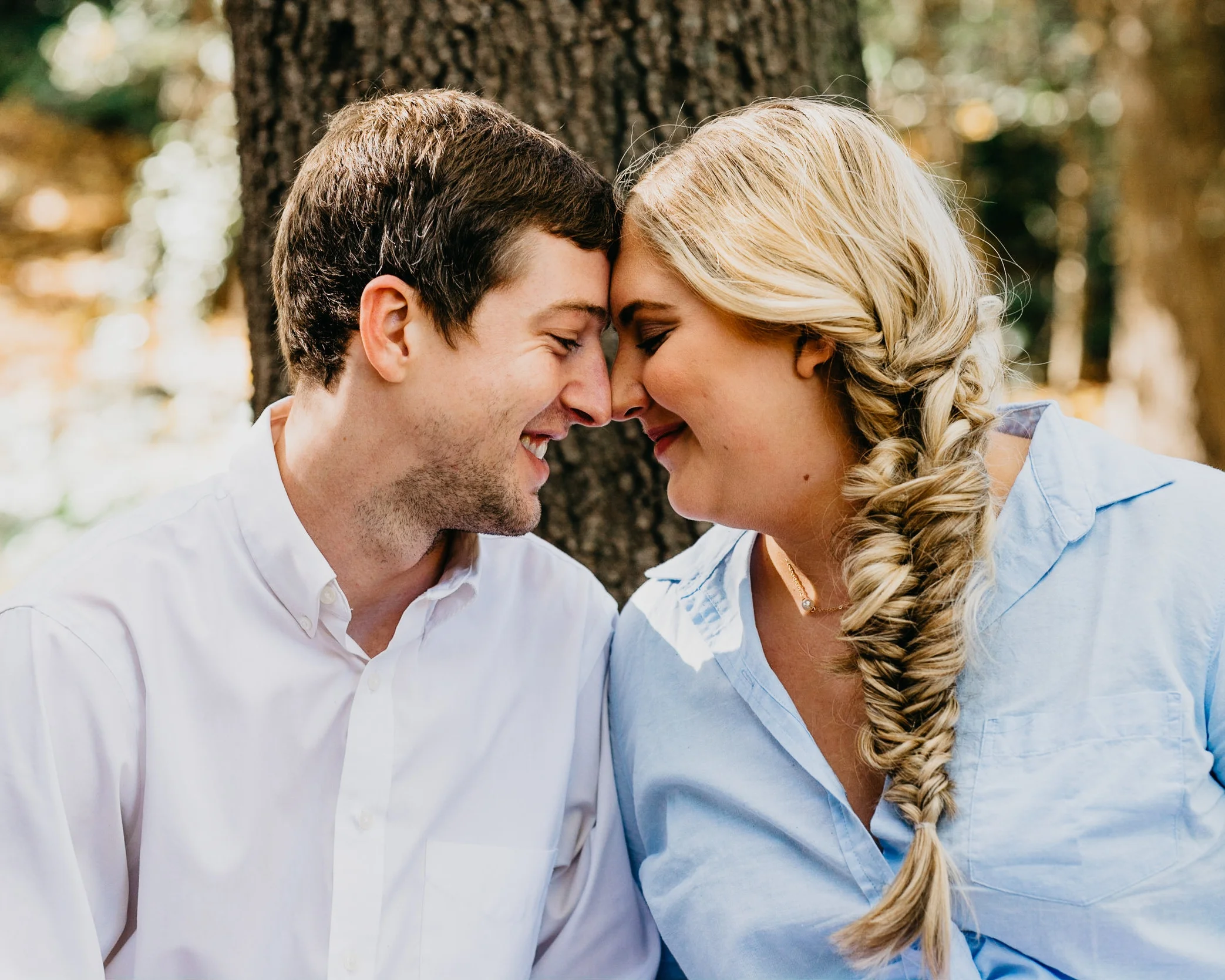 A couple sitting close together with heads touching, smiling in a park. The man has short brown hair and wears a white shirt, while the woman has long blonde hair in a fishtail braid and wears a light blue shirt. View fullsize