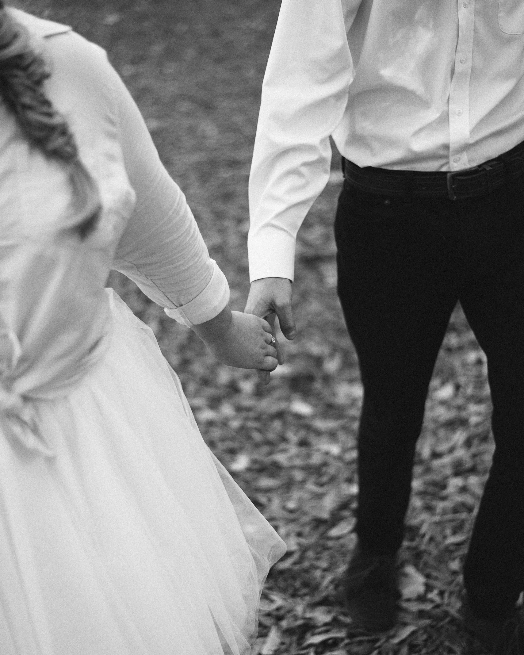Close-up black and white photo of a couple holding hands, wearing formal attire. The woman is in a dress with a braid, and the man is in a button-up shirt and dark pants. View fullsize