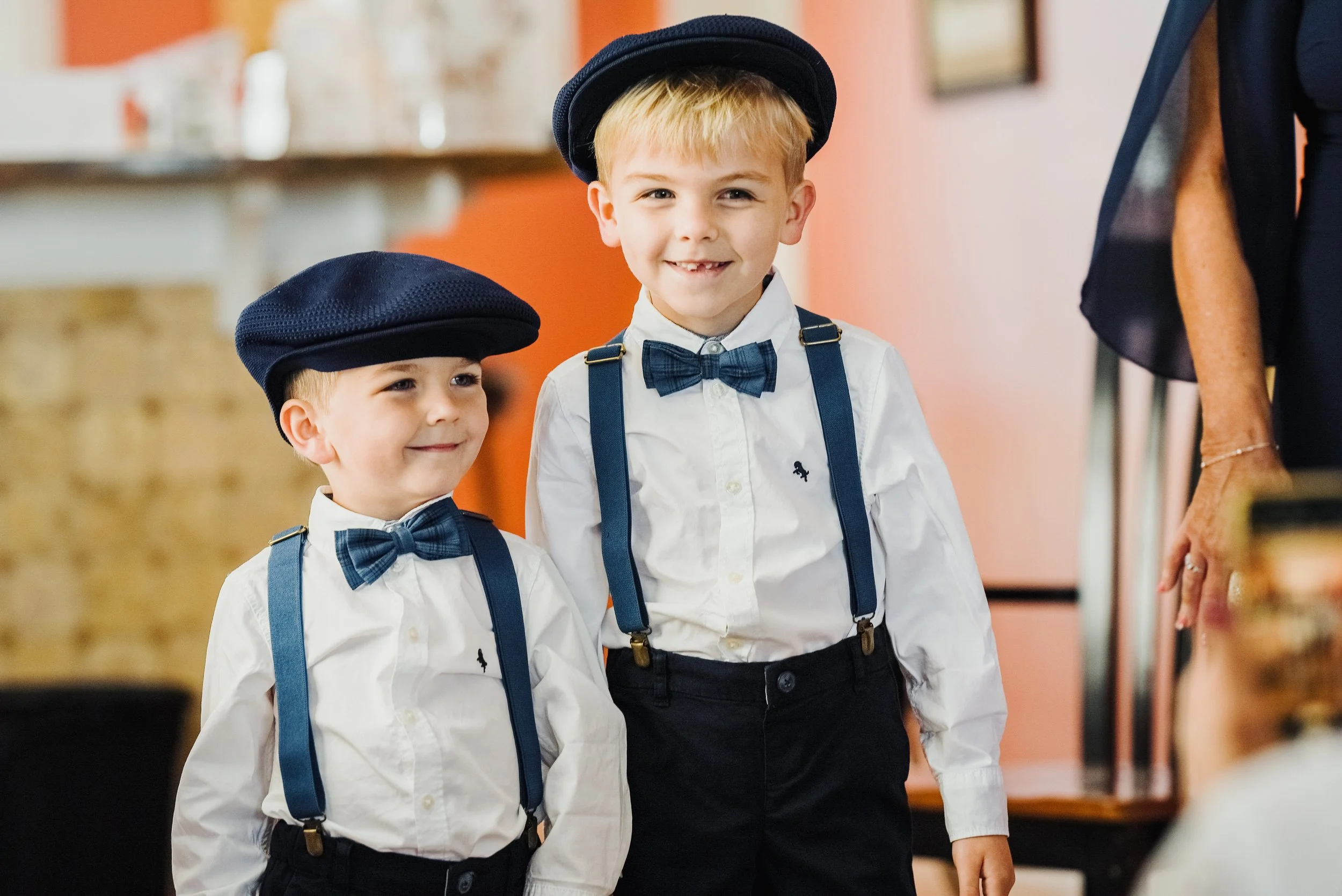 Two young boys dressed in formal attire with bow ties, suspenders, and flat caps smiling indoors. View fullsize
