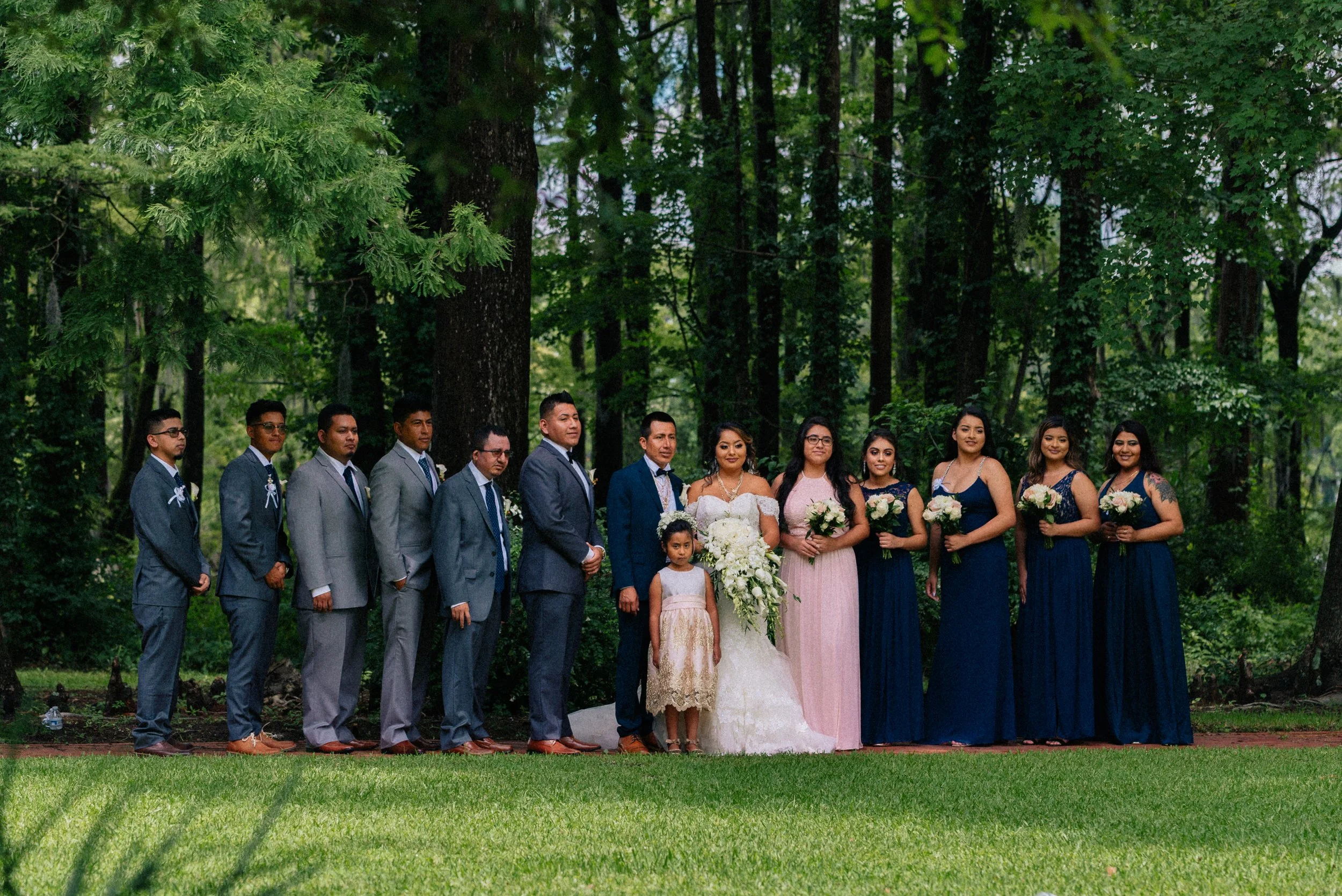 A wedding party poses outdoors in formal attire, with a bride in a white dress holding a bouquet, surrounded by bridesmaids in pink and blue dresses, groomsmen in suits, and a flower girl. The setting is a lush, green, wooded area.
