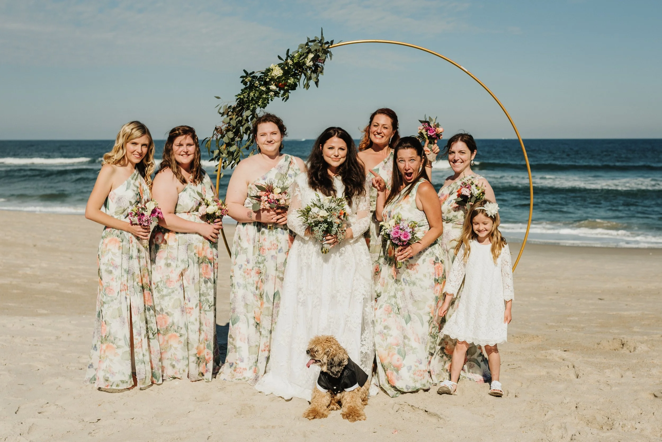 Bridal party on a beach with a floral arch and a dog. Woman in white dress is surrounded by bridesmaids in floral dresses, holding bouquets, with the ocean in the background. View fullsize