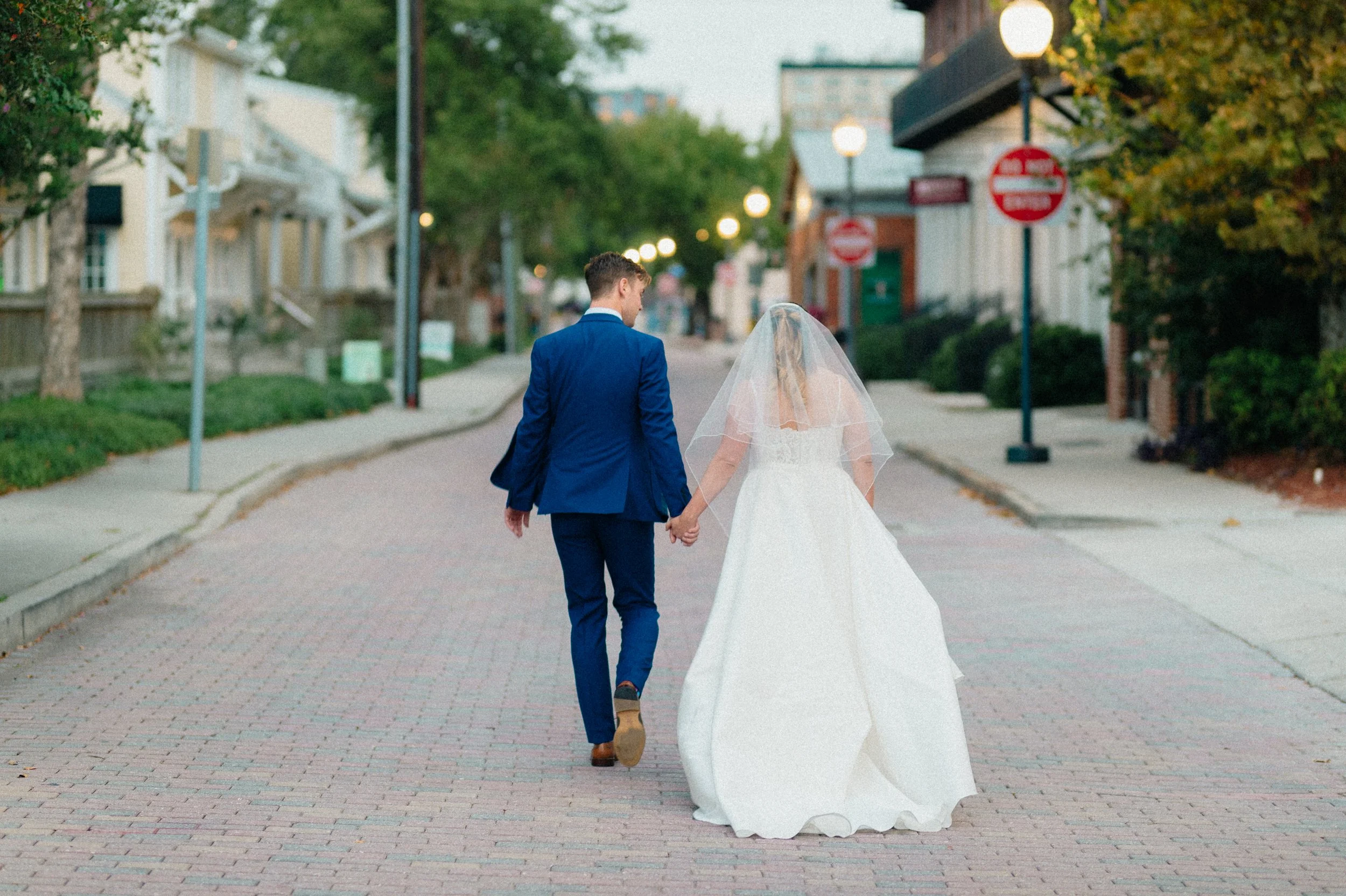 Bride and groom walking down a brick street in wedding attire, holding hands, with greenery and buildings in the background. View fullsize