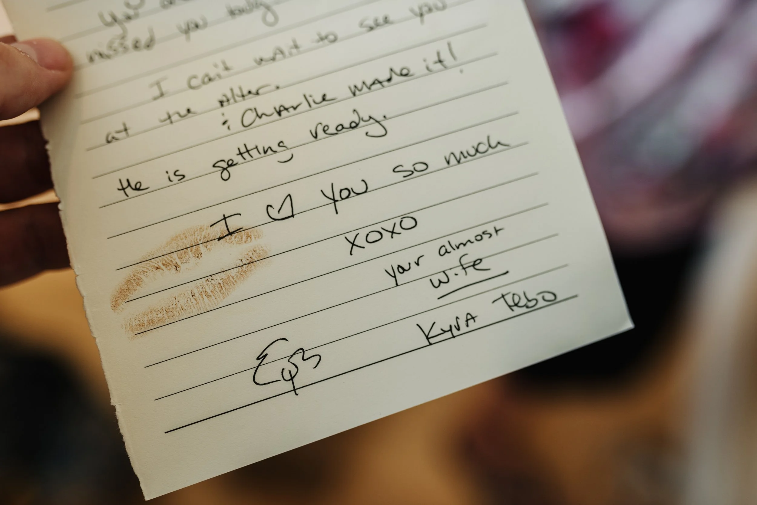 Close-up of a handwritten note with a lipstick kiss mark and message saying 'I love you so much' and signed 'your almost wife.' View fullsize