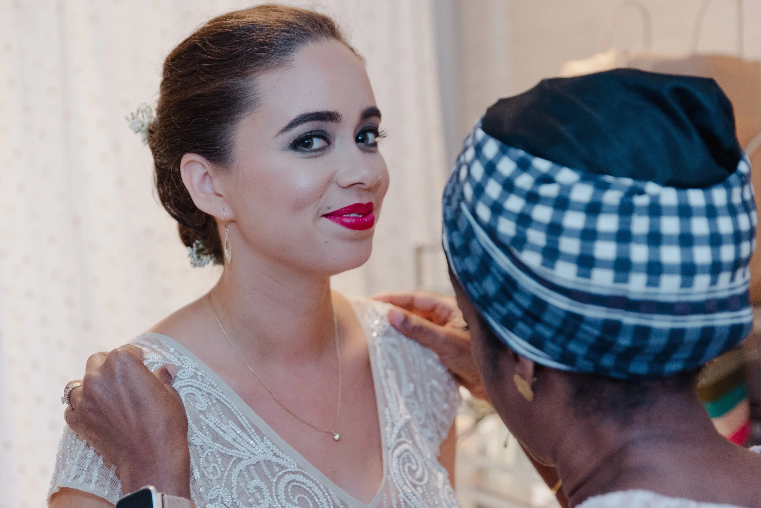 A woman in a white dress getting ready, assisted by another person wearing a blue checkered headscarf. View fullsize