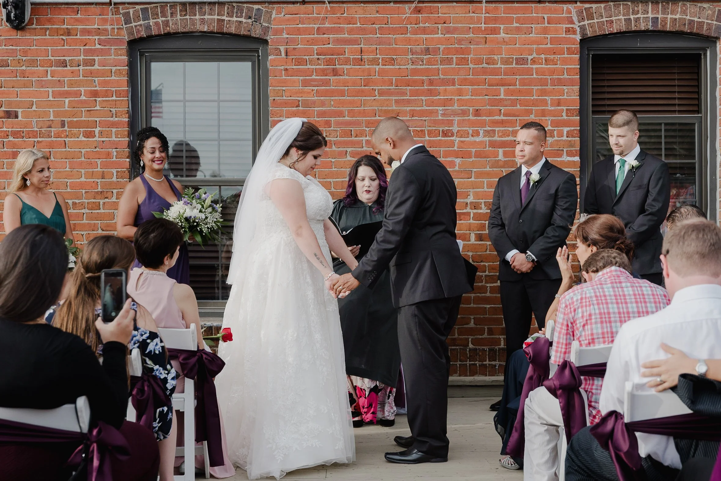 A wedding ceremony with a bride and groom holding hands in front of an officiant. Bridesmaids and groomsmen stand on either side, and guests are seated, some taking photos. The background features a red brick wall. View fullsize