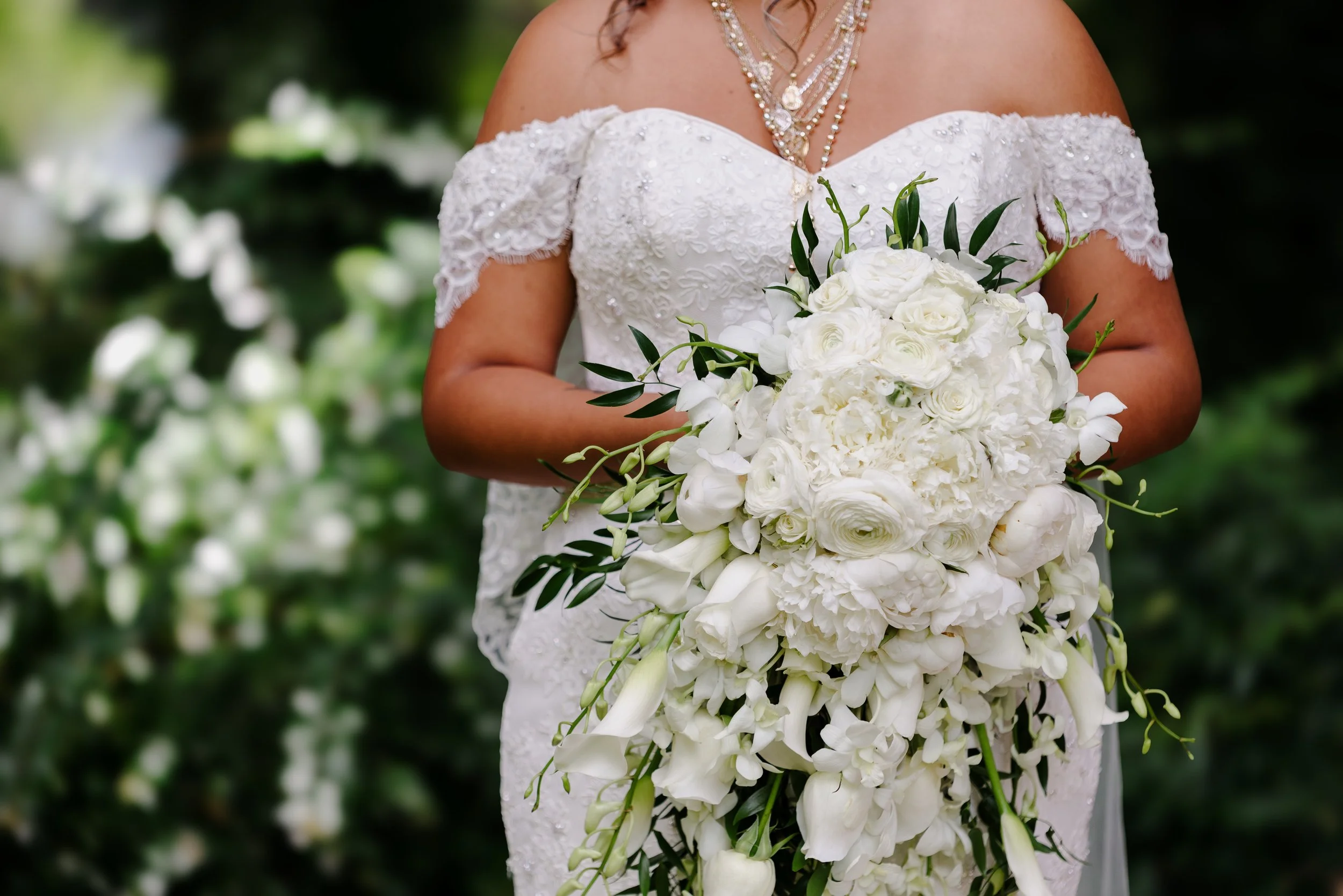Bride in white lace wedding dress holding a large cascading bouquet of white flowers.