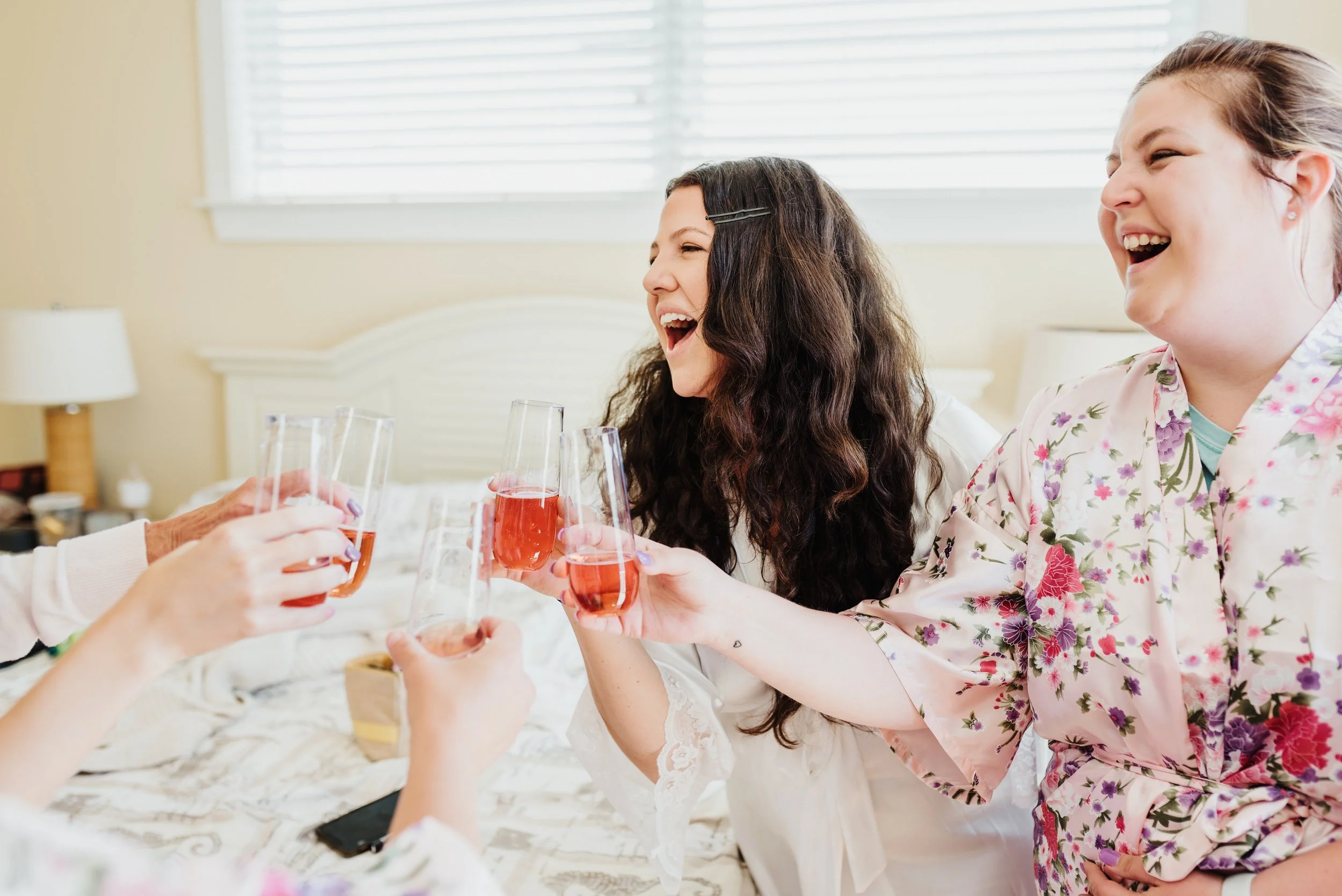Group of women in robes celebrating with champagne glasses indoors. View fullsize