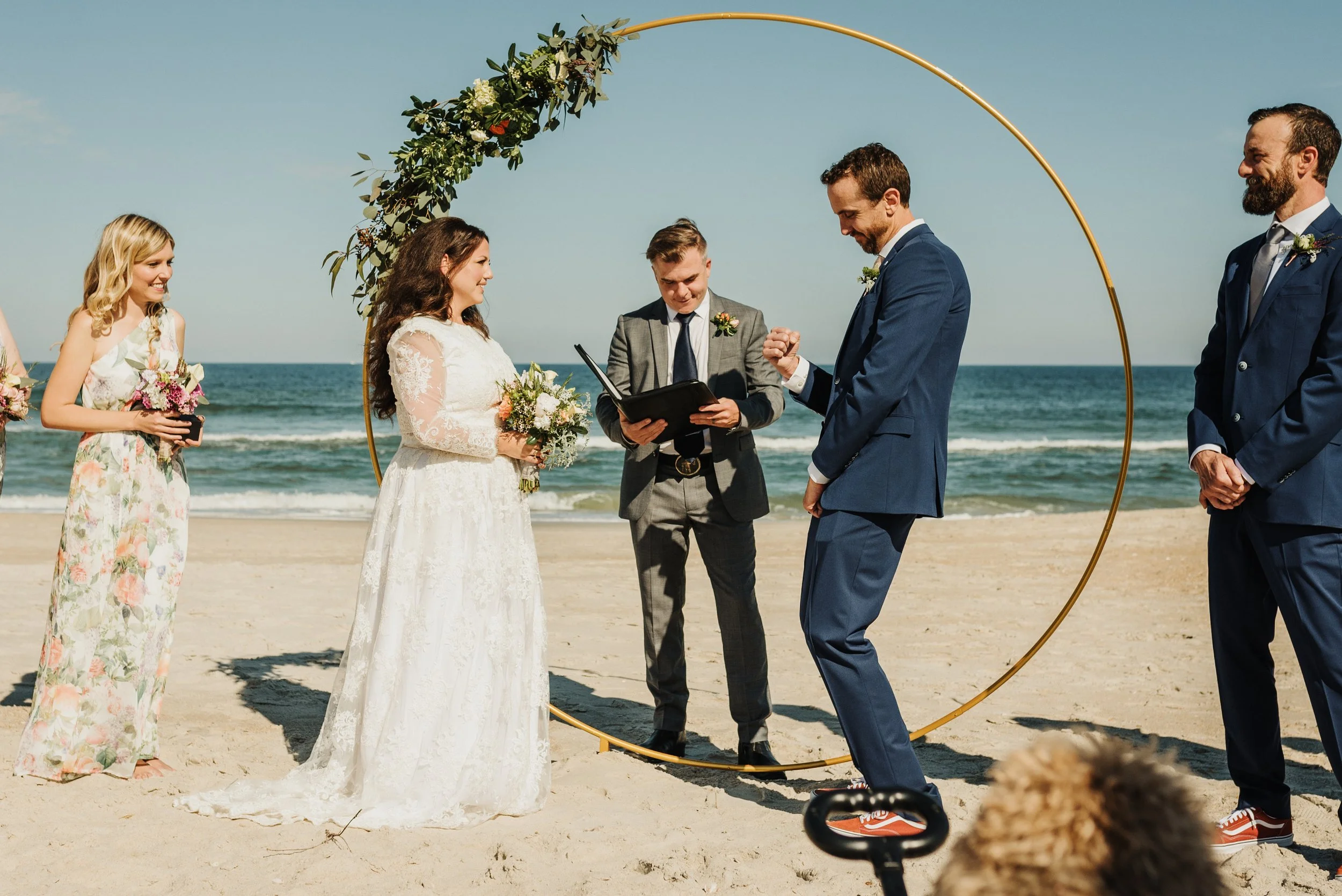 A beach wedding ceremony with a bride in a white dress, groom in a blue suit, officiant, bridesmaid, and groomsman standing under a round floral arch by the ocean. View fullsize