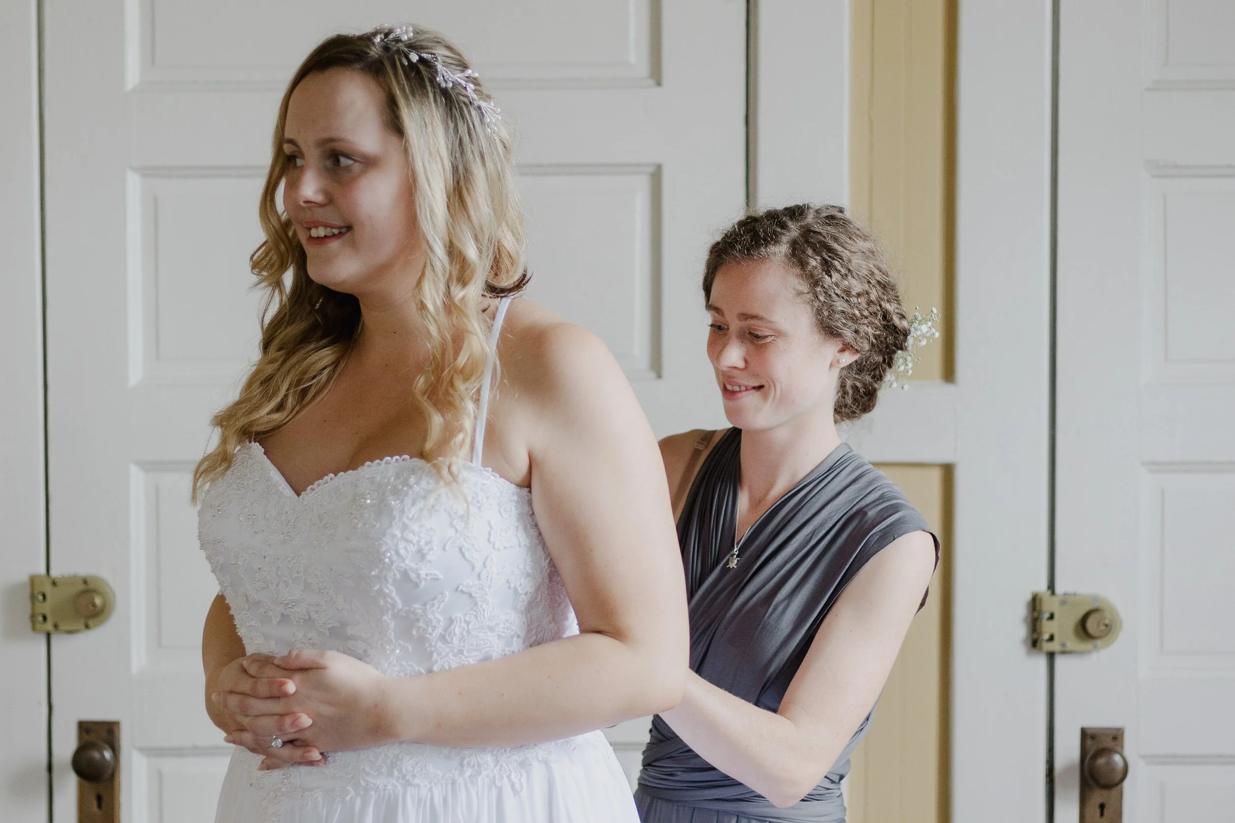 A bride in a white wedding dress being assisted by a woman in a gray dress against a backdrop of white paneled doors.