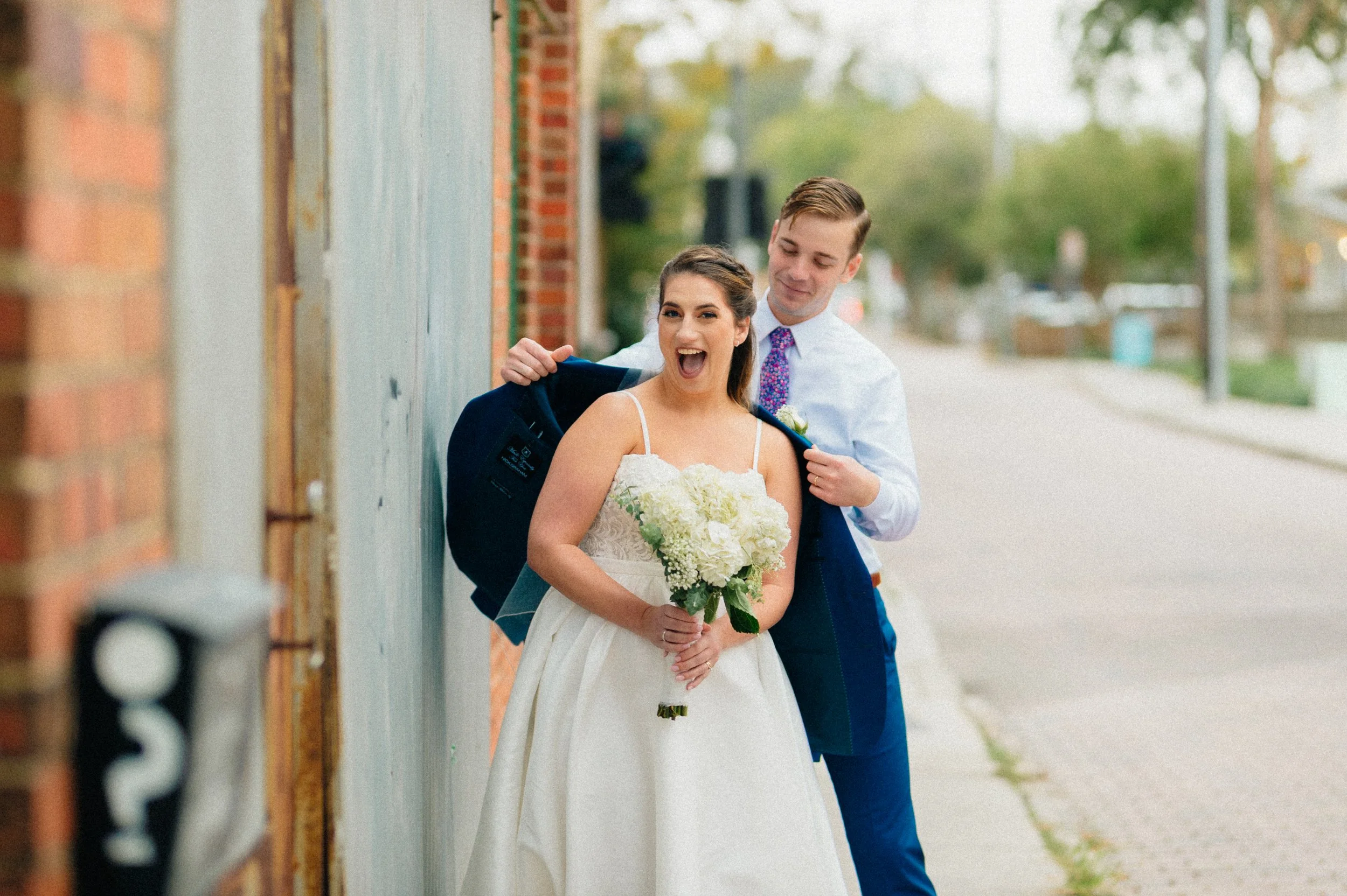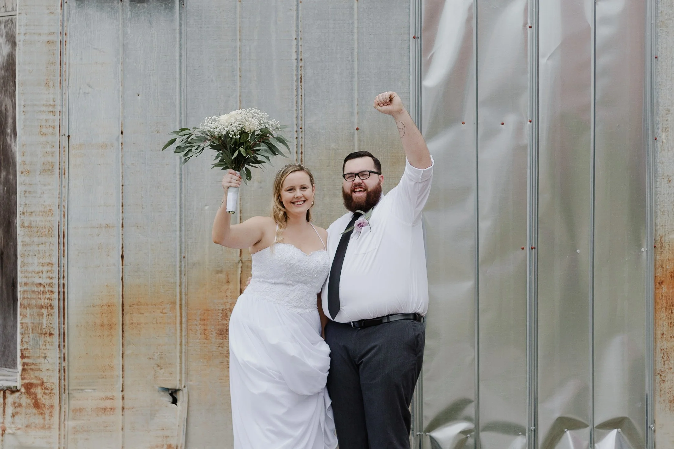 Bride and groom celebrating outdoors in front of a metal wall; bride holding bouquet, groom raising fist.