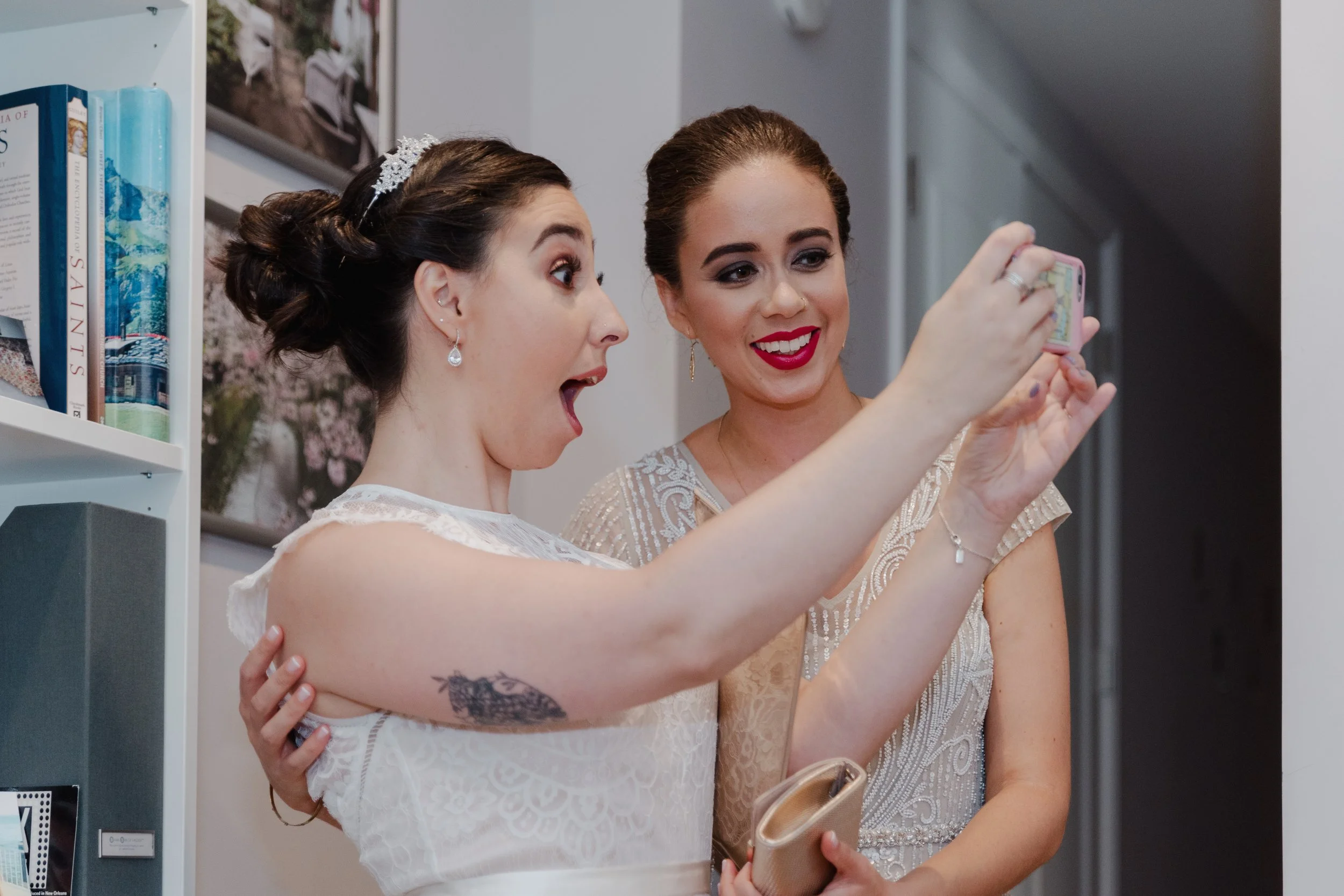 Two women in formal dresses taking a selfie, one with a surprised expression. View fullsize