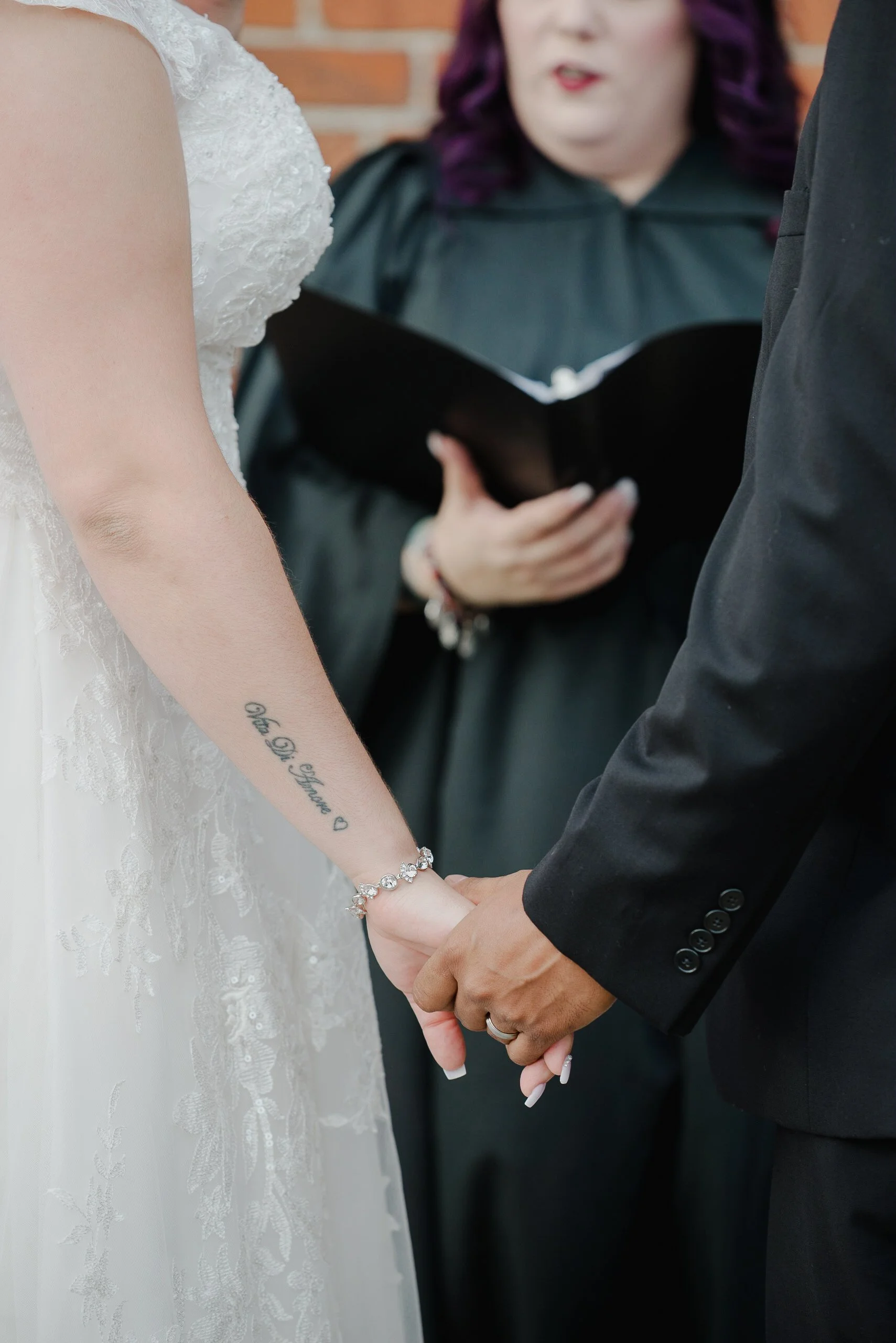 Close-up of a couple holding hands during a wedding ceremony with an officiant in the background. View fullsize