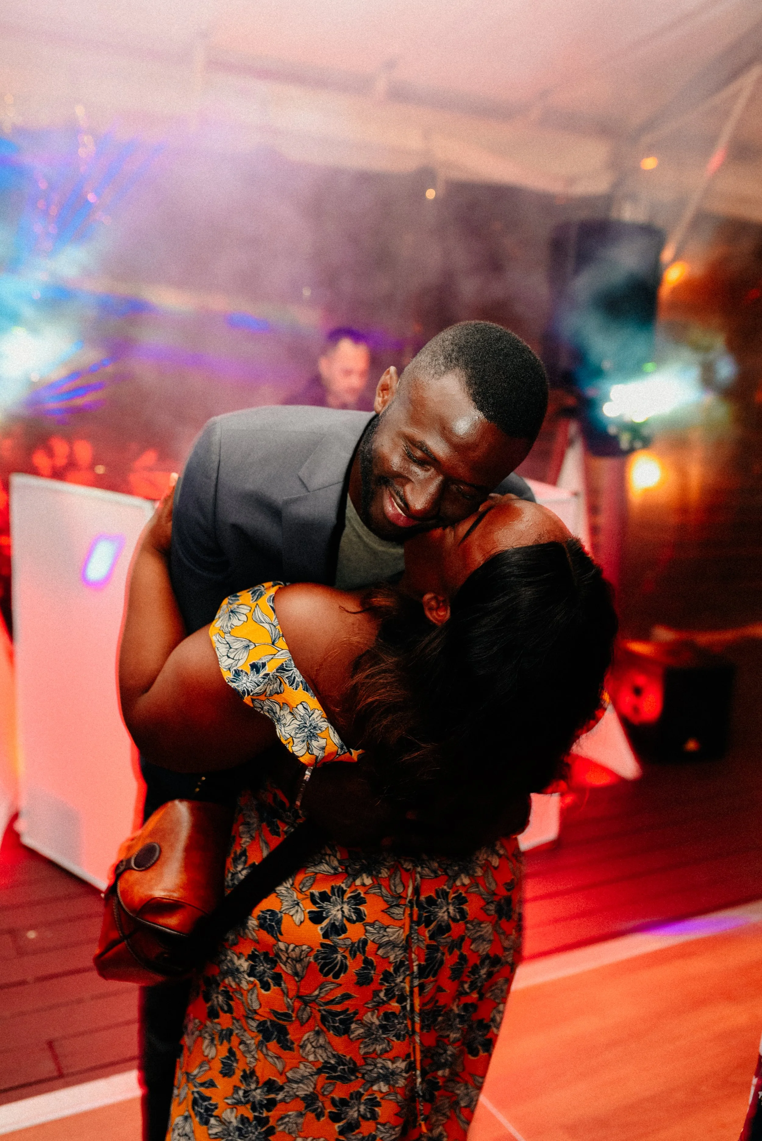 A couple dancing and embracing at a lively event with colorful lights and a crowded background. View fullsize